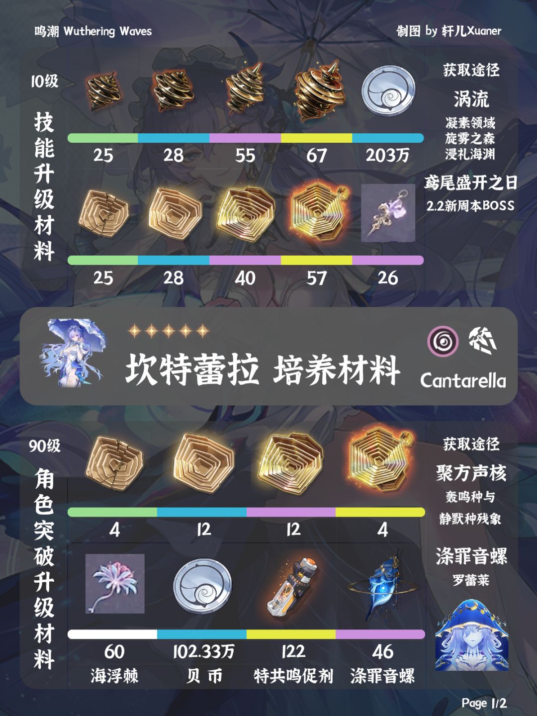 坎特蕾拉培养材料来啦,可以开始准备材料啦,包括坎特蕾拉突破升级材料、技能升级材料、专武海的呢喃突破升级材料。 ------------------------------------------------------- 涡流系列:在凝素领域·旋雾之森以及凝素领域·浸礼海渊刷取 聚方声核系列:轰鸣种和静默种的残象敌人掉落 镣环系列:流放者掉落,戴面具的人形怪 技能周本材料鸢尾盛开之日:2.2新周本