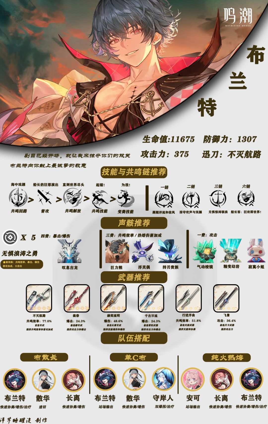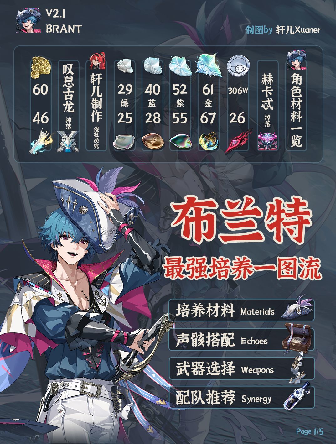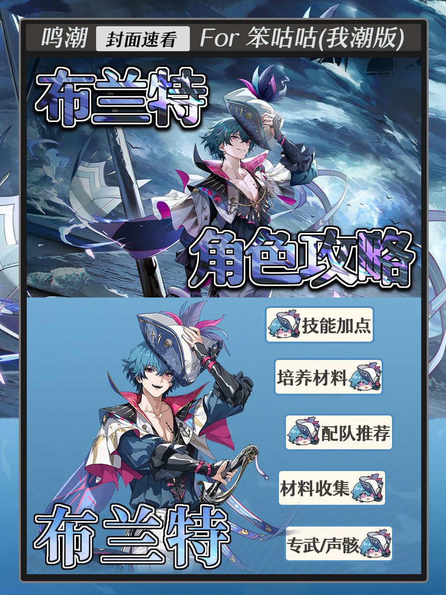 本篇攻略轩儿Xuaner给大家带来鸣潮布兰特的全方位养成思路,刚刚抽到船长的你不要错过哦~ ----------------------------- 本次鸣潮角色养成一图流正式启用新模板,包括以下更新内容: ① 配色采用角色主题色,且背景使用鸣潮末世偏暗色调风格,让大家看攻略的同时能融入鸣潮游戏本身。 ② 增加毕业推荐面板(这里只推荐双爆和效率数值范围,除此之外C为攻击力尽量往高叠)、伤害构成、