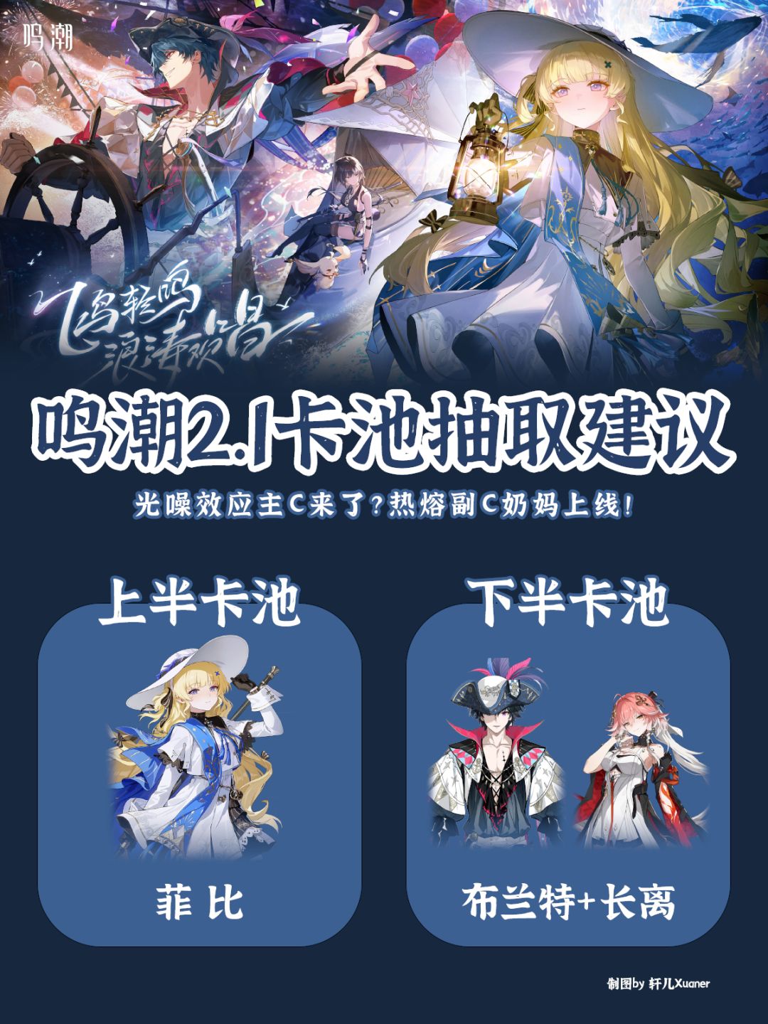 鸣潮2.1版本即将上线,轩儿Xuaner给各位老玩家或新玩家一些抽卡建议,仅供参考~ 上半卡池:菲比 下半卡池:布兰特+长离 菲比为首个光噪效应限五主C,是新机制,目前仅能和光主配队,未来有可能会搭配光噪效应大C,菲比转为副C。如果想玩光噪效应,建议抽个0+1备用。 布兰特定位热熔副C奶妈,有一定输出,又可以提供盾奶。适配长离,预计布兰特和长离是热熔队队友,共同服务未来热熔大C。如果是长离厨,可以