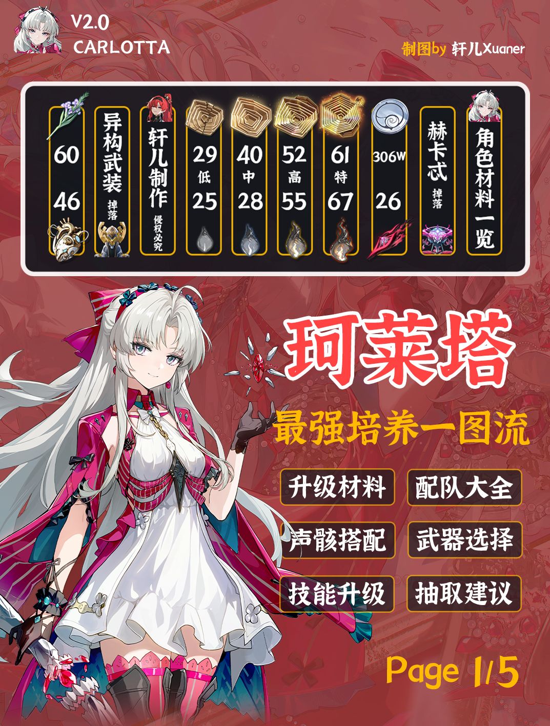 全新的2.0版本黎那汐塔来了,新角色珂莱塔将上线。珂莱塔的角色一图流攻略(先行版) [表情_比心]第二张图:90级技能全满所需的材料数量,大部分材料是新地图,所以不用着急,晶化燃素系料是可以和老材料3:1转换。 [表情_比心]现在千万不要刷旧冰套等2.0实装新冰套 (凛冽决断之心) 2.0上线后会发珂莱塔各种队伍的强度如何强度榜也会随后更新,希望大家点个关注🙏#鸣潮 #鸣潮攻略 #鸣潮珂莱塔 #鸣