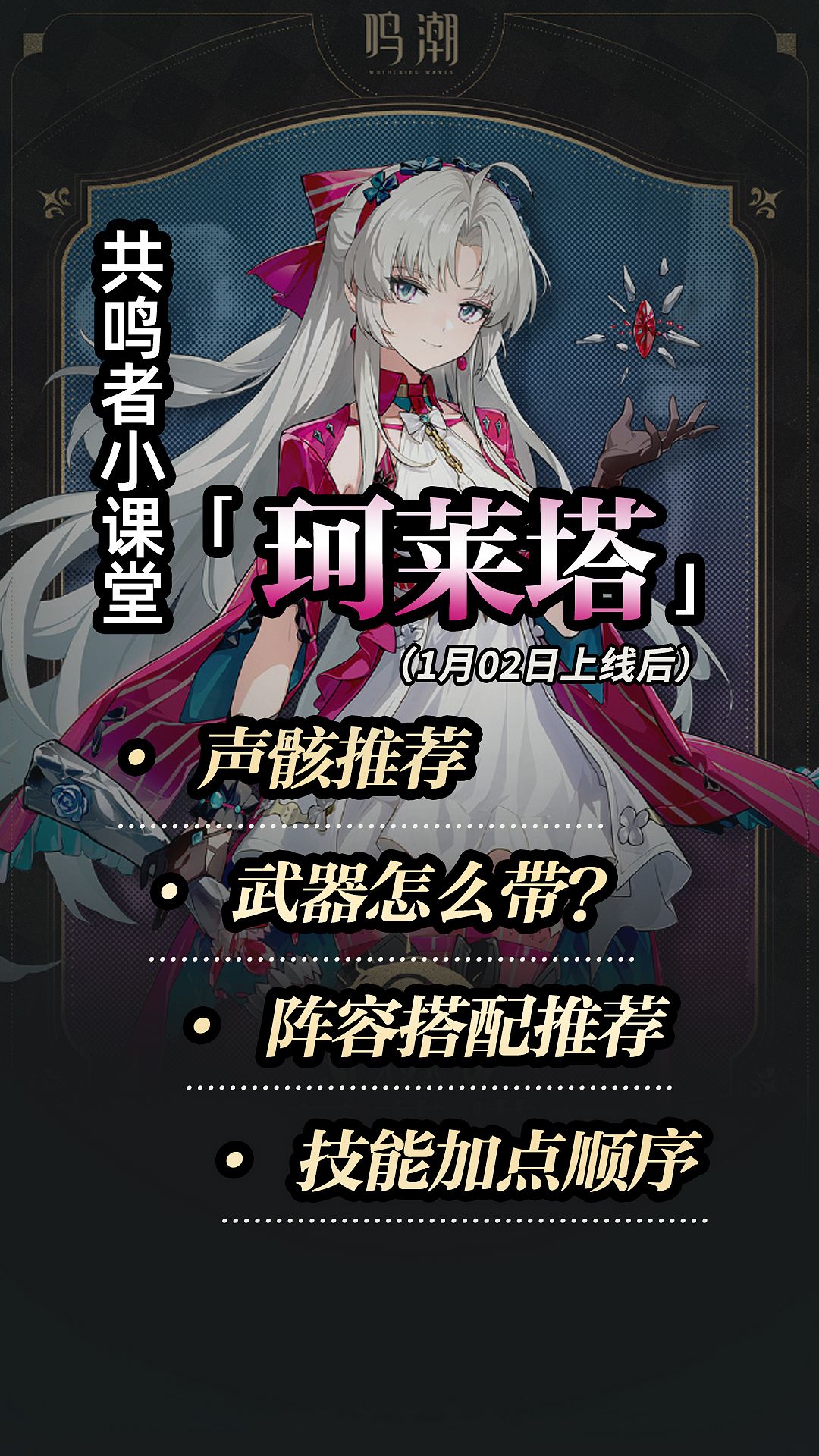本篇攻略给大家带来鸣潮珂莱塔的全方位养成攻略,刚刚抽到珂莱塔的你不要错过哦,图文攻略内容包含养成材料、配队、武器、声骸、技能、共鸣链等内容~ 珂莱塔定位冷凝佩枪主C,一定程度上弥补了冷凝和佩枪没有限定大C的情况,珂莱塔90%以上伤害均由共鸣技能完成,因此在武器声骸配队选择上首先考虑共鸣技能加成,推荐至少要抽0+1,也就是一个角色+一把专武,使用专武和常驻五星枪停驻伤害差距预计在20%以上。推荐抽取