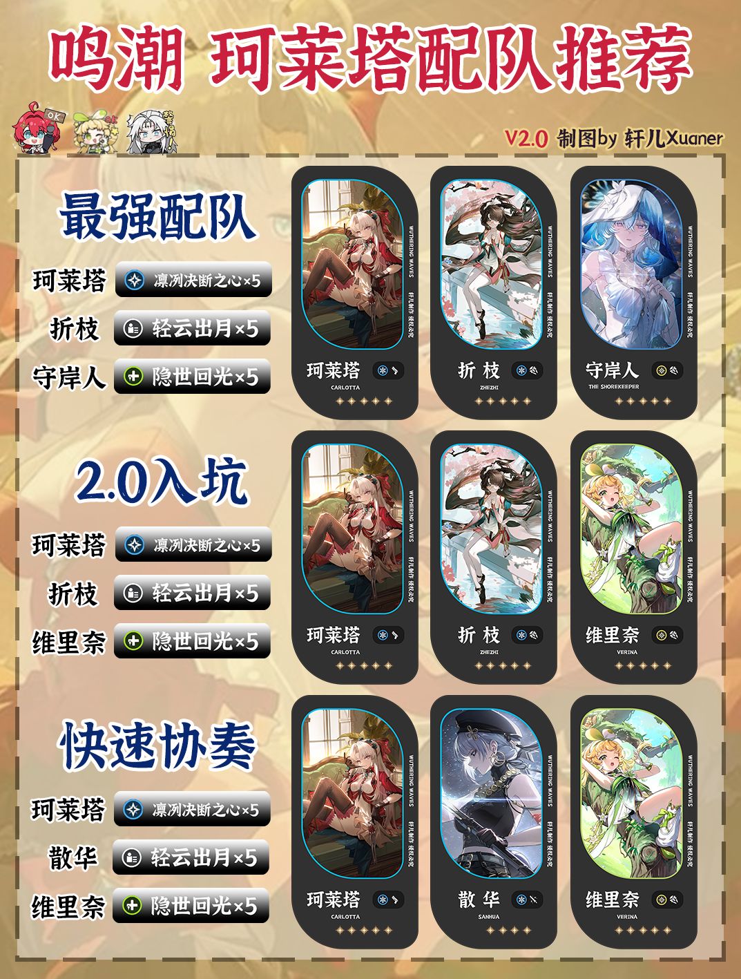 轩儿给大家带来珂莱塔主C的六种配队 1、珂莱塔+折枝+守岸人:目前珂莱塔最强配队,折枝延奏技能加冷凝增伤和技能增伤,珂莱塔可以吃到。折枝可以使用轻云套,也可以使用新的协同套。 2、珂莱塔+折枝+维里奈:针对1.4版本后入坑没有守岸人的玩家。 3、珂莱塔+散华+维里奈:这套主要利用散华快速协奏,散华既可以使用轻云套做辅助,也可以选用两种冰套做副C。 4、珂莱塔+灯灯+守岸人:不抽折枝的下位替代,不过