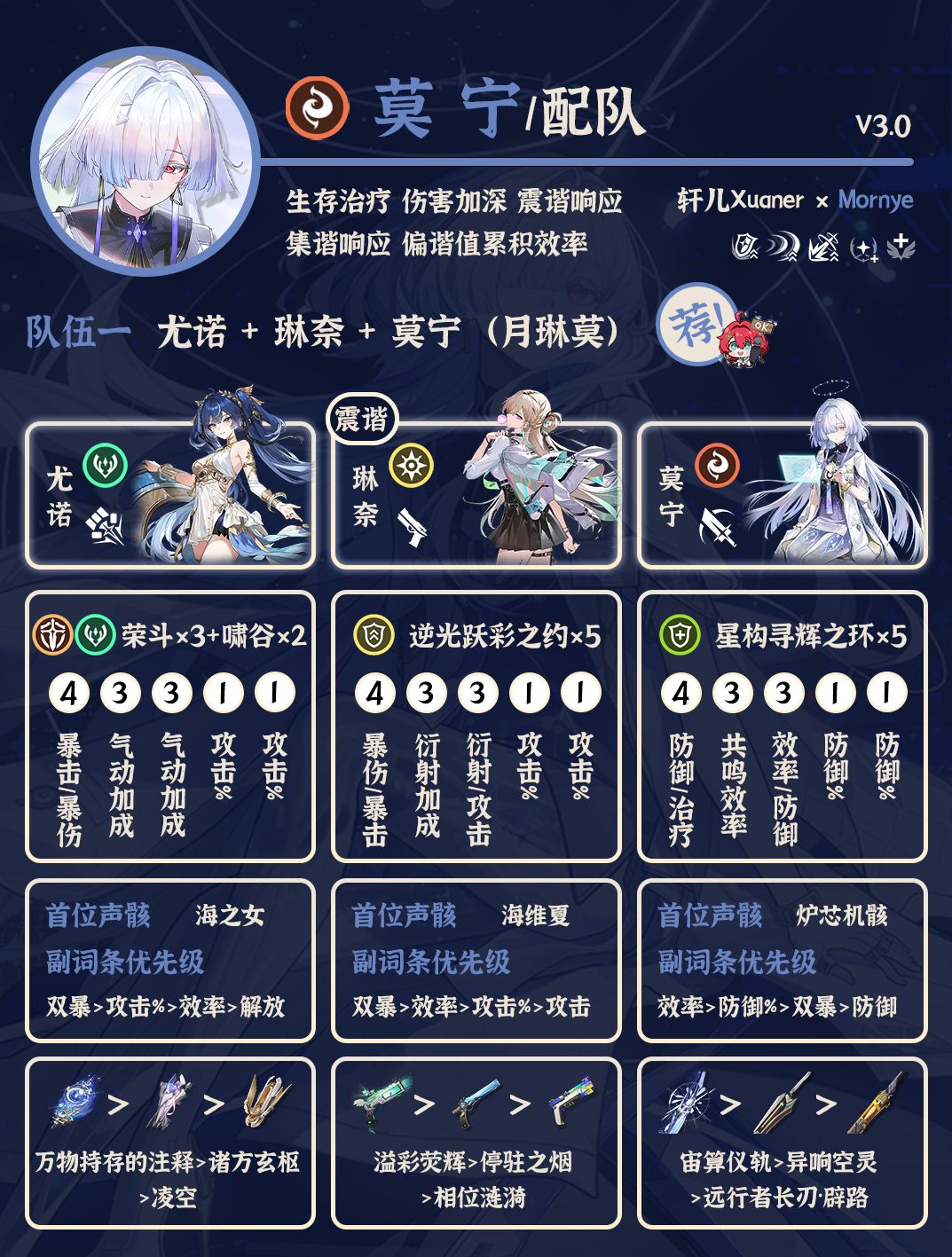 本篇攻略轩儿Xuaner给大家带来鸣潮维里奈的全方位养成思路,新手刚刚抽到维神的你不要错过哦~ ----------------------------- 维里奈定位衍射奶妈,目前版本除守岸人外必备奶妈,新手入坑后自选首选常驻五星角色,比较通用,适配各种队伍。推荐共鸣链1、2、4。四链提供的额外衍射增伤会进一步加强衍射主C输出能力,比如今汐。武器一般携带奇幻变奏,如果是氪佬可以上守岸人专武。 声骸