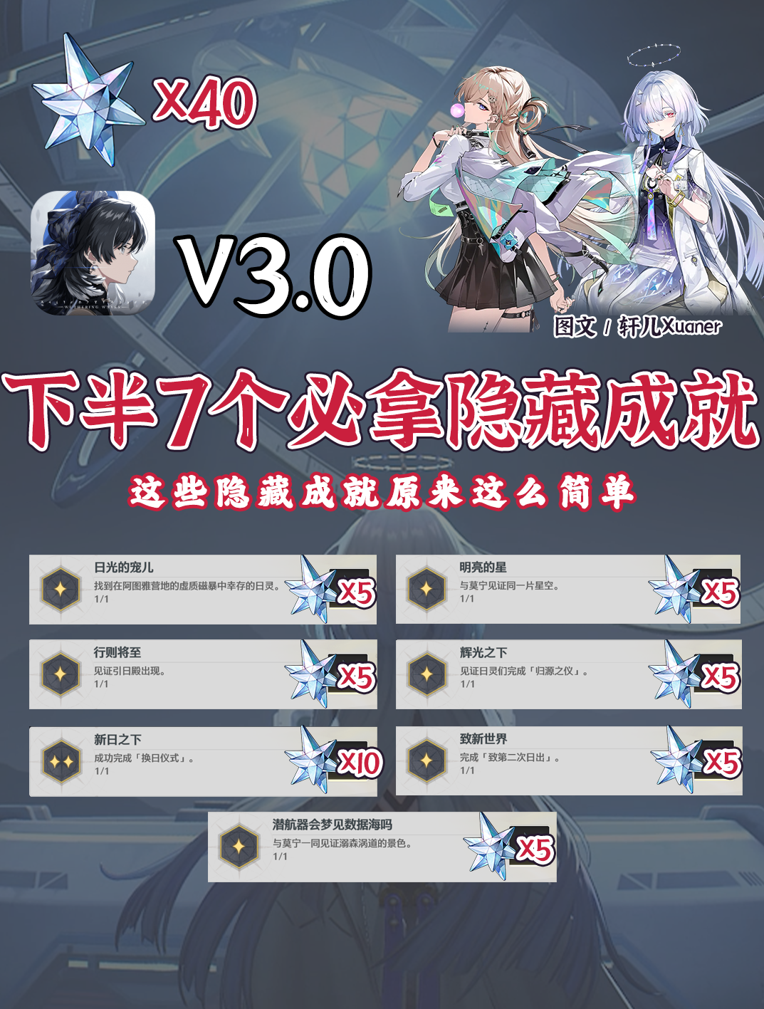 轩儿Xuaner给各位整理了鸣潮3.0下半版本7个隐藏成就,都是做任务就可以拿到,非常简单,大家拿来确认一下就好~-------------------攻略食用指南① 隐藏成就是指未在成就列表中列出的成就,只有在你完成该成就后才会显示出来。一般包括一些大世界探索的彩蛋和打一些特殊的怪物② 每页图文展示隐藏成就的地点和完成流程,漂泊者按照顺序操作即可③ 有部分漂泊者询问【找回来了,都找回来