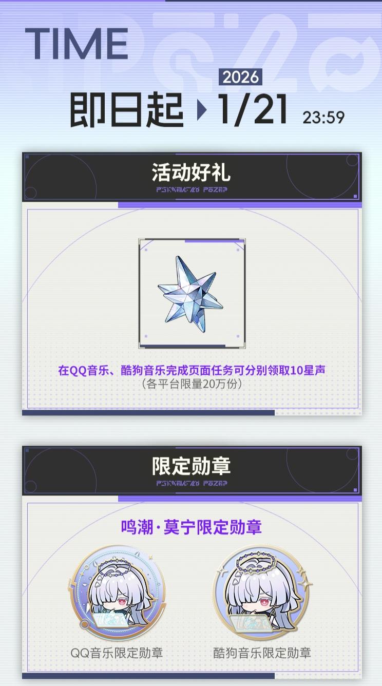 ‼️3.0版本福利再加码!《鸣潮》「我们生而眺望」主题音乐联动正式上线,携手QQ音乐、酷狗音乐送出双重福利,20万份免费星声+限定装扮限时开抢,漂泊者们快冲不亏~‼️✅️本次联动福利诚意拉满,核心奖励直击抽卡刚需:即日起至2026年1月21日23:59,漂泊者只需打开QQ音乐或酷狗音乐,搜索关键词「鸣潮」进入活动页,完成简单关注、听歌任务,即可分别领取10星声奖励,双平台累计可免费解锁20星声!