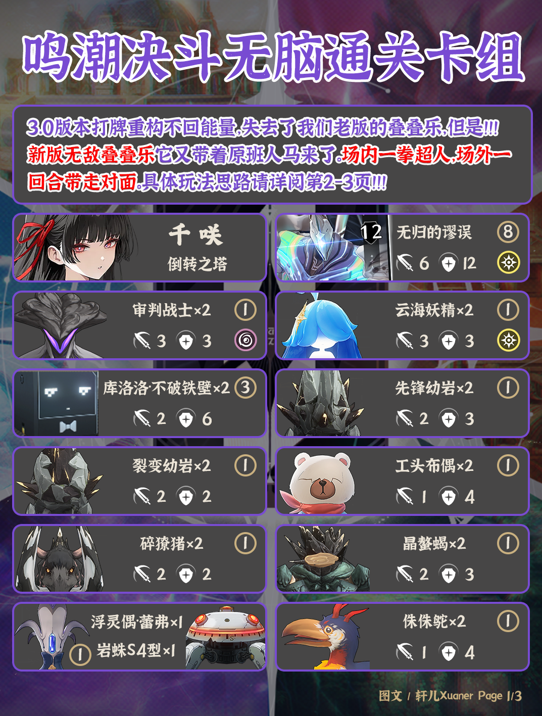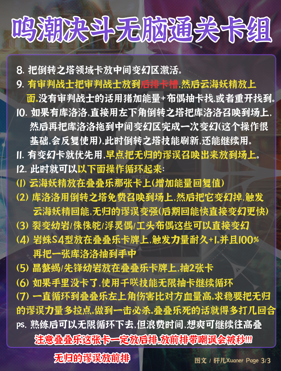 鸣潮新的打牌活动荣耀之丘:激斗重燃来了,这次水温比较高,大家都有什么思路!轩儿Xuaner这里带着上一期的老朋友叠叠乐来了,如果熟练后是无敌秒杀任何对手的,如果有需要的话学起来!务必要认真阅读玩法思路后再开始,体验一把就上手了!----------------------战术:千咲(开局多1点能量,后期配合无限抽卡)领域:倒转之塔(前期配合变幻3费节省能量,后期无用)核心声骸:无归的谬误(