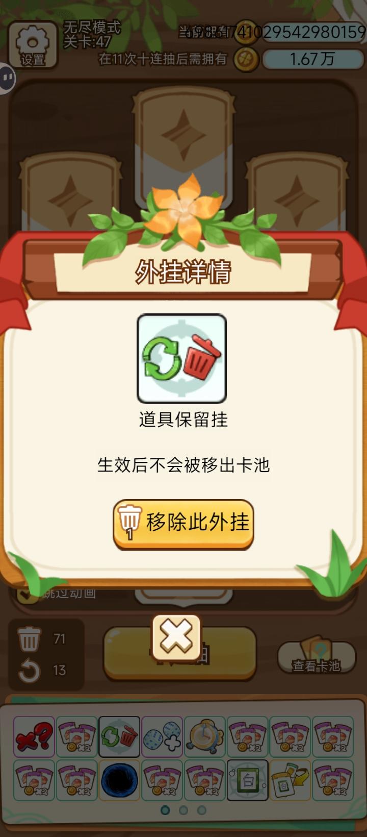 核心是大量333宝物的翻2倍的叠加加上保底卡转白板(有白板翻一倍的外挂更好)再加上三张相同的卡(蝴蝶不重要,随便三张相同的就行)提供基本数值;想要不看广告刷新,尽快拿到抽三次送一个刷新的宝物(或者留一张刷新卡加不移除外挂会更好,可能容易不相邻?难说),这个后面会很有用,可以帮助我们刷新到需要的宝物或卡;接下来在外挂选择中多拿箭头加两倍的外挂(需要刷新,这里已经拿了6个),如果有五回合全部相邻的宝物