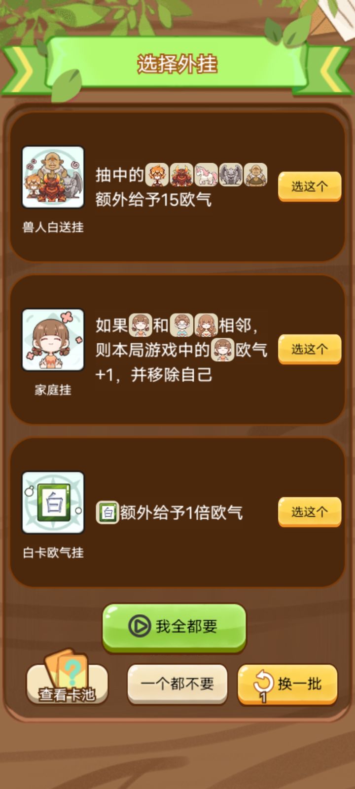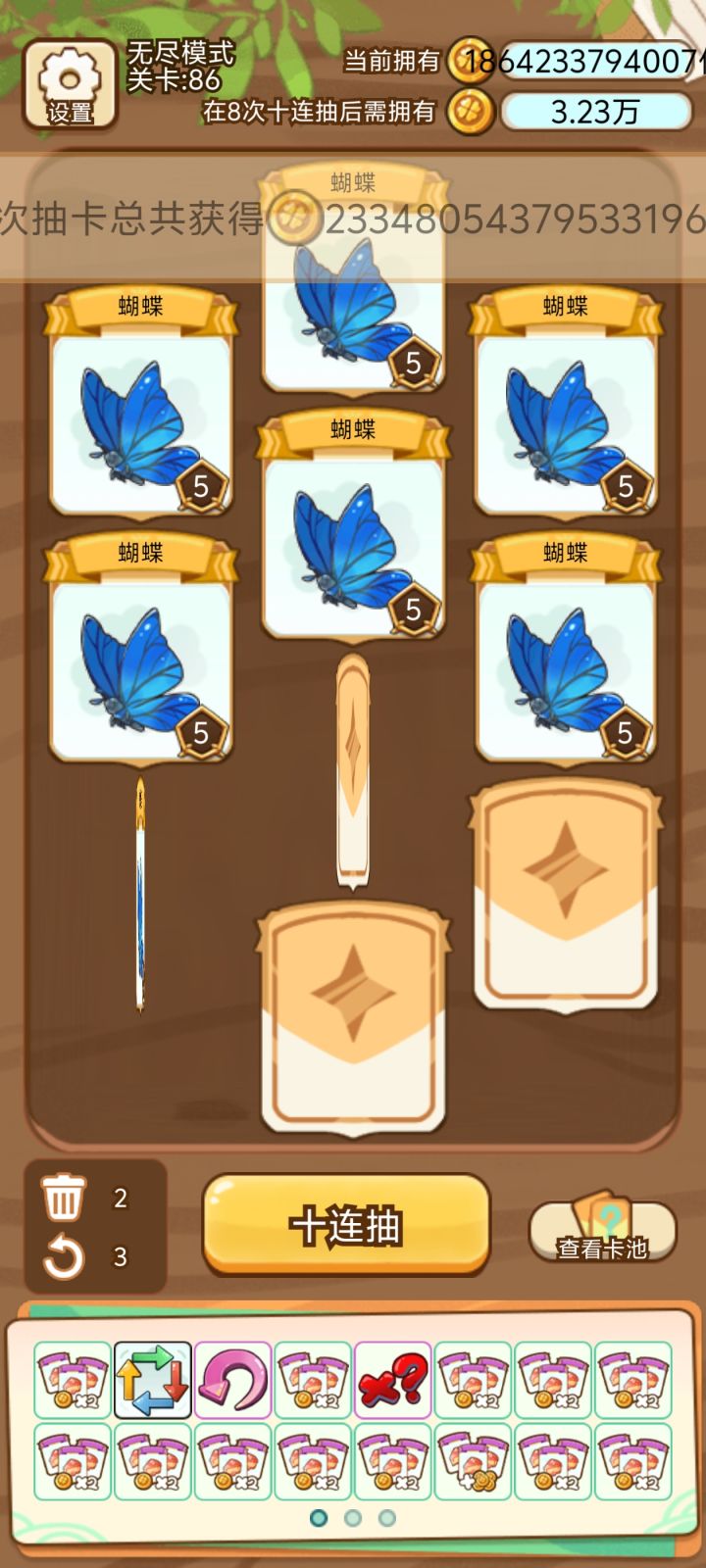 核心是大量333宝物的翻2倍的叠加加上保底卡转白板(有白板翻一倍的外挂更好)再加上三张相同的卡(蝴蝶不重要,随便三张相同的就行)提供基本数值;想要不看广告刷新,尽快拿到抽三次送一个刷新的宝物(或者留一张刷新卡加不移除外挂会更好,可能容易不相邻?难说),这个后面会很有用,可以帮助我们刷新到需要的宝物或卡;接下来在外挂选择中多拿箭头加两倍的外挂(需要刷新,这里已经拿了6个),如果有五回合全部相邻的宝物