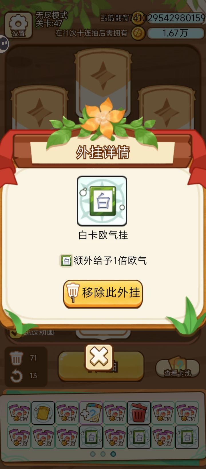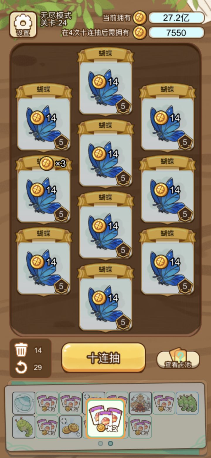 带3个农夫不知道有没有提升,结算太久了,懒得整了。 幸运房东,但是格子给的更少版,开了无尽后的关卡,废卡塞得太多了,开局要拿的过渡太多,删卡给的又少,无尽爽一爽就得了。(其实无尽做的难度梯度也很一般,后面应该加快要求提升速度的_(:3」∠)_ )
