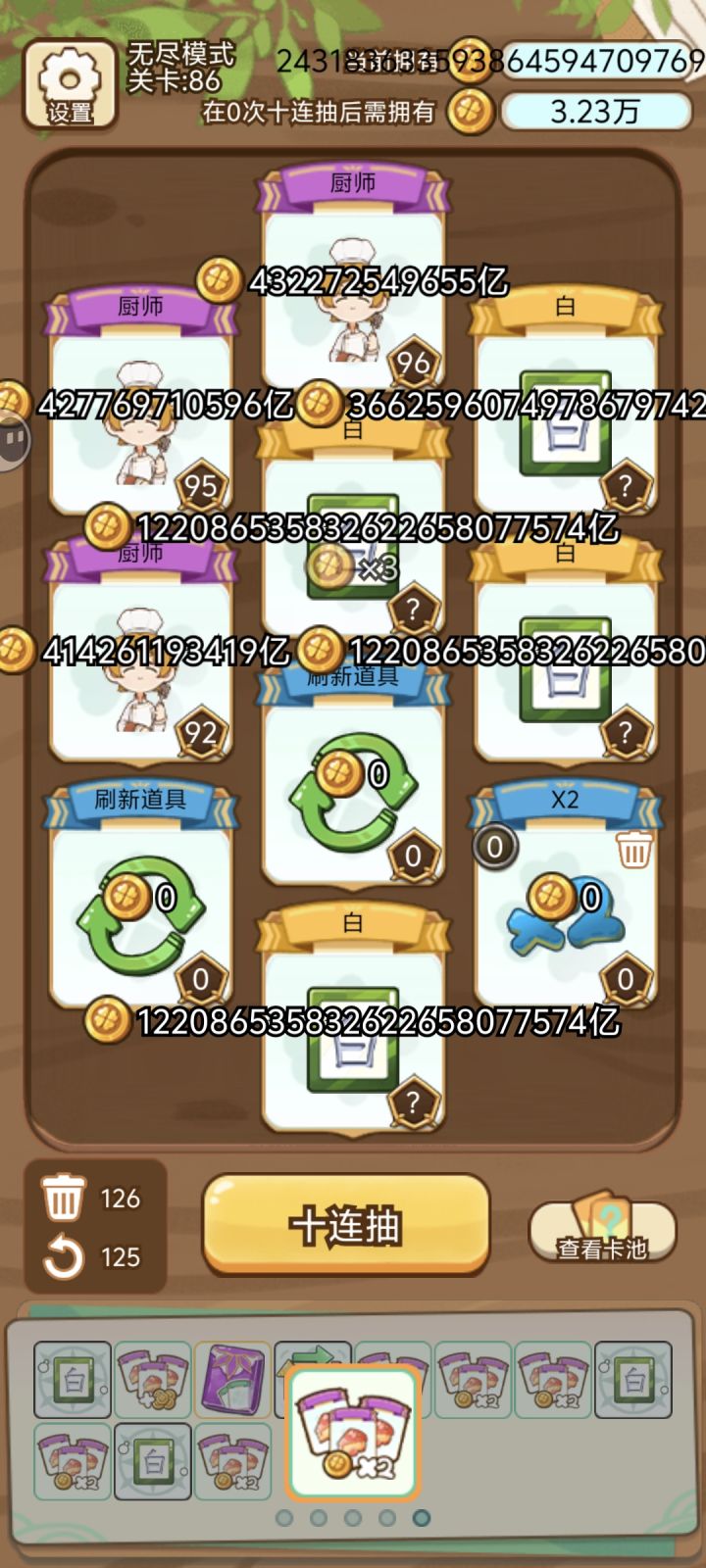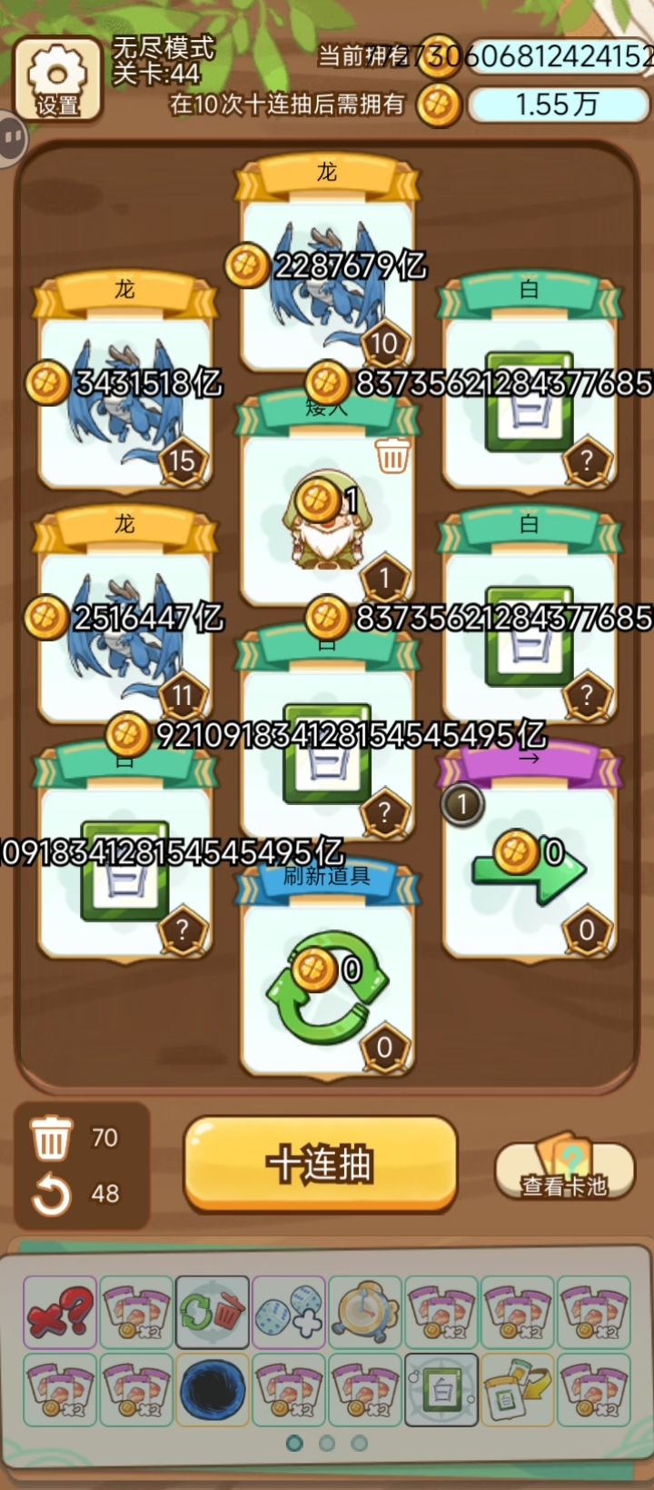 做个总结发育几百关的龙>凤凰>龙>妈娃刷分核心是333,在有3核3白的情况下,一个333相当于分数x9。其次外挂的白卡欧气挂,每选中一个分数x2(这是为什么说妈娃不行,还搁那娃+1呢,人家2ⁿ起飞了都,靠外挂成长的全都拼不过)接下来的问题是如何稳定刷到333和白卡欧气挂,那就需要道具保留挂+2刷新道具(1刷新道具看脸)接下来说卡池,3白(保底)+2刷新固定。剩下5个空位,5凤凰算768/2妈3娃36/龙看刷了多少。分数=核心基本分x(9ⁿ,n=333数量)x(2ⁿ,n=白卡欧气数量)后面40这个是新打的(不是极限