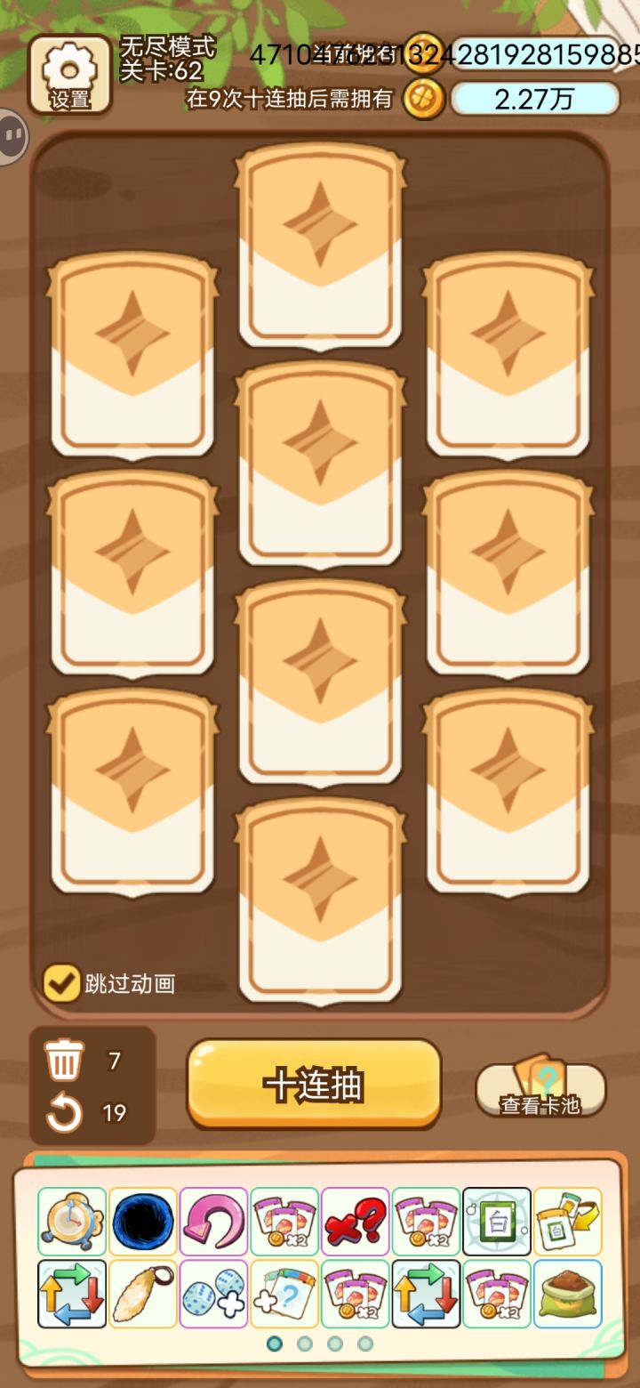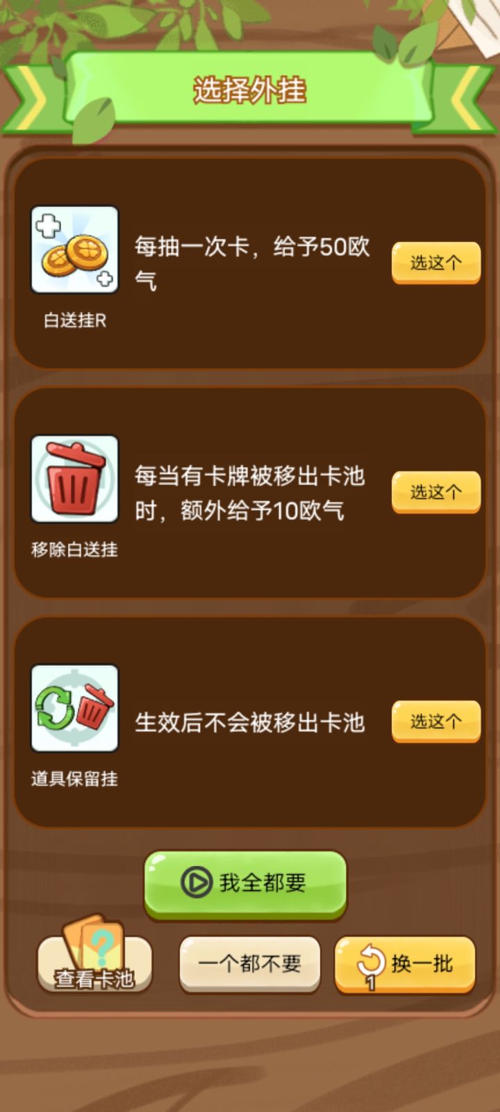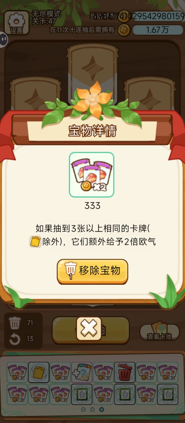 核心是大量333宝物的翻2倍的叠加加上保底卡转白板(有白板翻一倍的外挂更好)再加上三张相同的卡(蝴蝶不重要,随便三张相同的就行)提供基本数值;想要不看广告刷新,尽快拿到抽三次送一个刷新的宝物(或者留一张刷新卡加不移除外挂会更好,可能容易不相邻?难说),这个后面会很有用,可以帮助我们刷新到需要的宝物或卡;接下来在外挂选择中多拿箭头加两倍的外挂(需要刷新,这里已经拿了6个),如果有五回合全部相邻的宝物