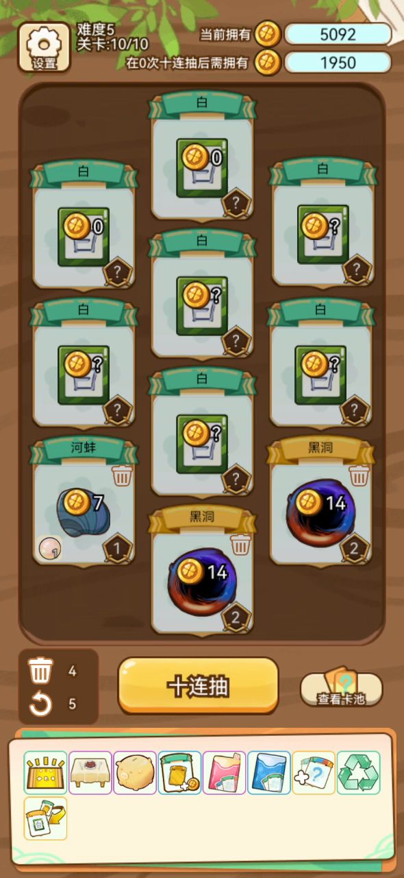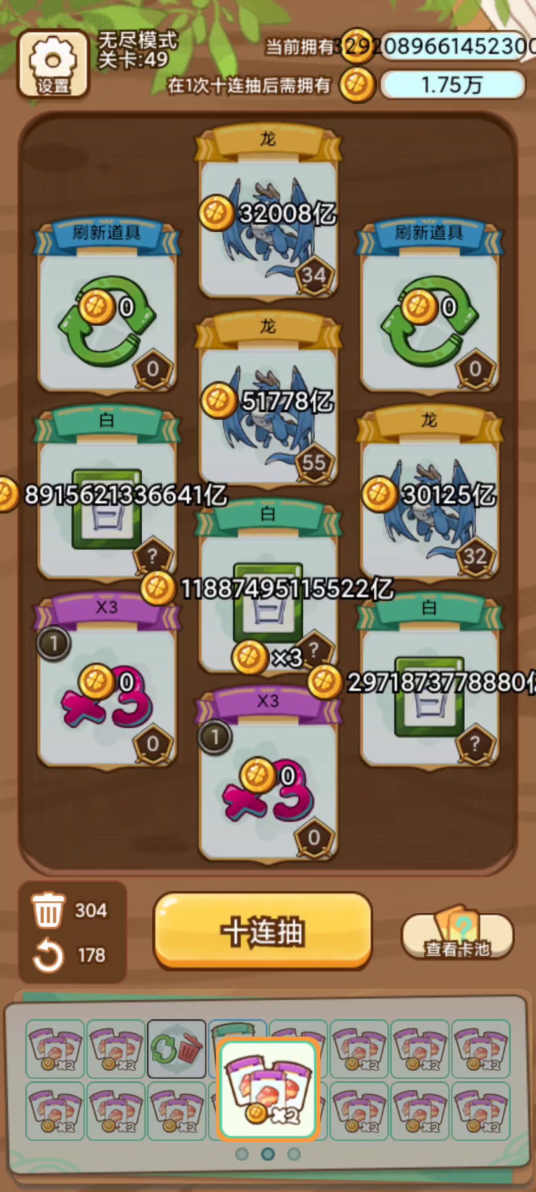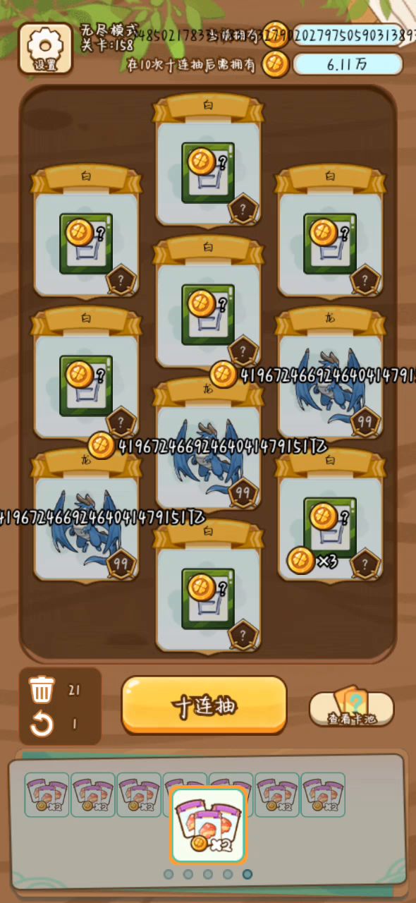 道具保留挂前期首选,拿到保留可以挂两个刷新,从此根本不缺刷新,不需要了就可以删掉,自选卡牌一定要拿四个龙,宝物必备一个逆转,剩下的全拿加倍,给八个矮人的宝物也可以拿一下,拿完就删,可以一直刷