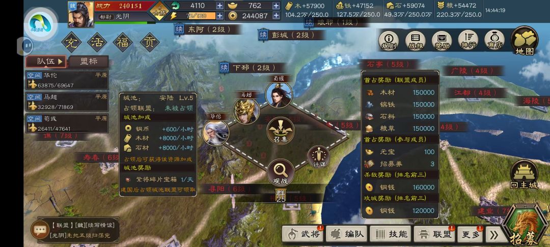 #主公跑跑跑 游戏独特的迷雾系统,使游戏有更多的可玩性,但是令初期玩家烦恼的是中心资源州都有山河阻挡,无法快速打开中心资源州的视野,尤其在没有大佬带队的服。这里教大家如何快速剥开资源州的迷雾,以便在天下大势达成后快速打开资源州的视野,方便占地。 资源州与普通州都有一些直接相连或贴临的地点,如第一张图所示。前期可让同盟号占领这些地方,这样就能在天下大势达成时显现出资源州。建议选择临近的城市向资源州拓