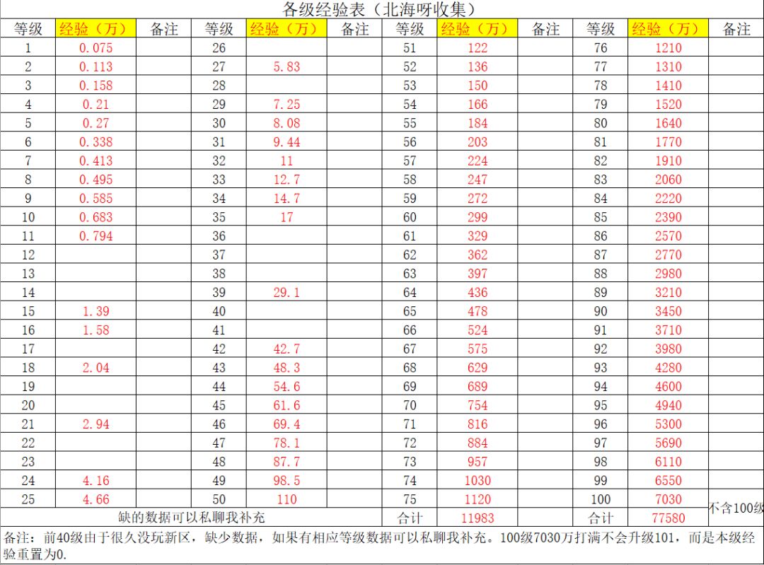 双倍刷地来了,为了方便大家刷地,总结了各级经验表以供大家参考。部分低级数据存在不足,不过无伤大雅,如果有新区的小伙伴有这些低级等级数据,可以评论补充,谢谢。也希望能帮助到大家,共同进步,肝他。