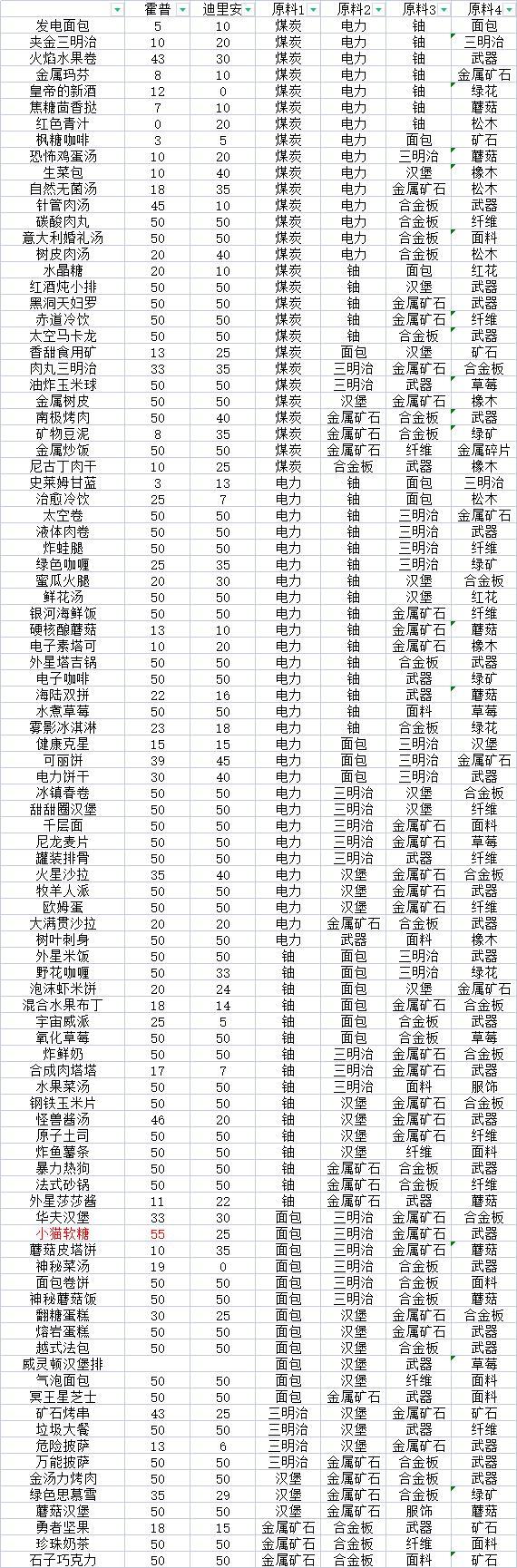 感谢楼主,后面好多菜单我没去试验除了因为没开武器工坊的原因,还有一个原因就是后面有些彩蛋食材顺序紊乱,武器在纤维的前面把我看蒙了,还有一个武器前3个问号的菜谱简直噩梦,本来还懊悔忘了截图记录就结束测试,现在不用担心正式服又得重新来一遍了