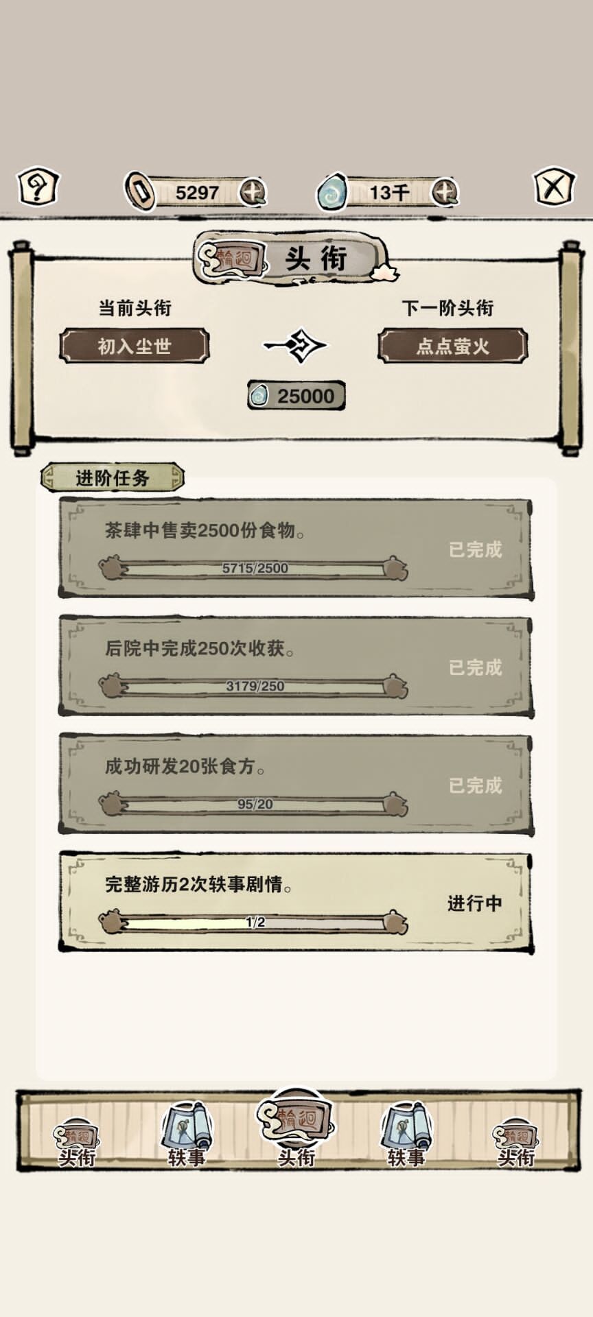 目前头衔升级奖励有一个灯笼,更新商店可购买的外观,以及一个食方许愿签(没有看到明确获得,但是我每次升头衔会发现包里多了一个),以后也许还会添加其他内容(请一定要添加!) 【天地初开】0阶 【初入尘世】1阶 基本过完新手任务就看到了,就不多说啦。 (出入尘世的灯笼超好看,比三四阶的都好看呜呜呜) 【点点萤火】2阶 升级条件: 茶肆售卖2500份食物 后院完成250次收获 研发20张食方 完成2次轶事