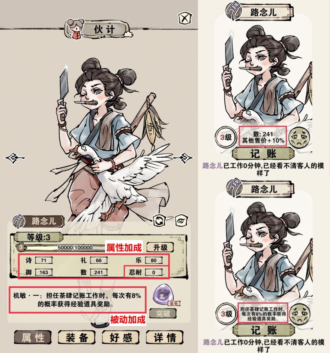 发现到2.1.3版本仍然适用。 新出的伙计银雀海芙蓉都无法替代工作职位,她俩适合去探索。 【伙计安排】 基本按照他们的特效,有些位子可根据不同阶段灵活调整。 注:伙计属性对职位加成非常高 记账:路念儿(经验),苏娘子(好感) 有宋漆园的时候优先路念儿,因为宋漆园会给大量好感,而经验物品需求的数量远高于好感物品。 没有宋漆园的时候,前期优先苏娘子,因为前期好感的需求度优先于经验。干活儿的伙计好感刷够
