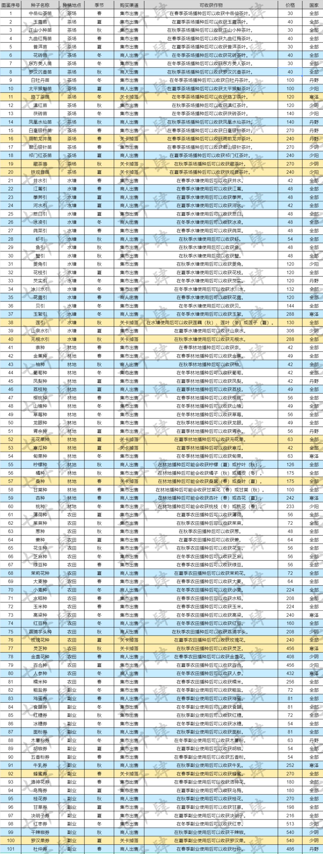 【攻略】种子全览(附价格和生长时间) 感谢景妗大佬提供的数据! 补充说明: 【1】*为种子商人处用灵石购买 【2】目前仅能许愿获得(斜体,价格以?表示):无花果种、寒瓜种、路丁茶苗、桑种、玫瑰花种、蜂蜜券、雨前龙井苗、铁观音苗、无根水引、莲引、灵芝种、罗汉果券 【3】同一种种子,蓝紫金三种颜色对应不同产物和生长时间 欢迎捉虫~