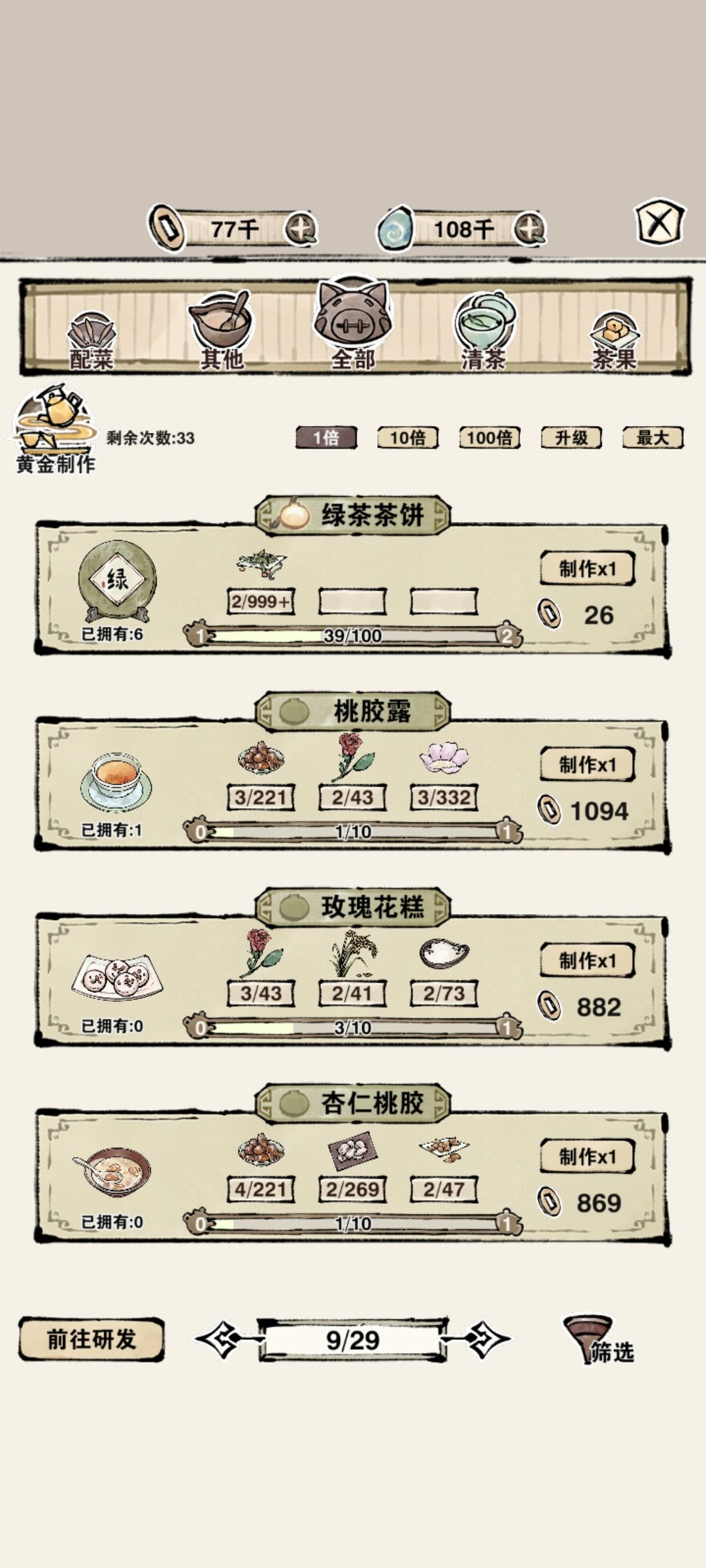 首先轮回是可以刷的,就是开业只上一个食物,比如最便宜的绿茶饼,然后直接结束营业。这样就能快速刷轮回。 就目前开放的内容来说,建议速刷一次轮回即可,开放所有功能。比如第七年酿酒,第十年一键种植等等。且经过一次轮回之后,开灵石铜钱袋子或是看广告,获得的都是最大值。 再往后刷,玩法上基本没有增加了,外出会解锁各个地点,但是现在没啥用,就是每天总共能得十次食材。 不过成就里面会送不少招募令。 达到2/5/