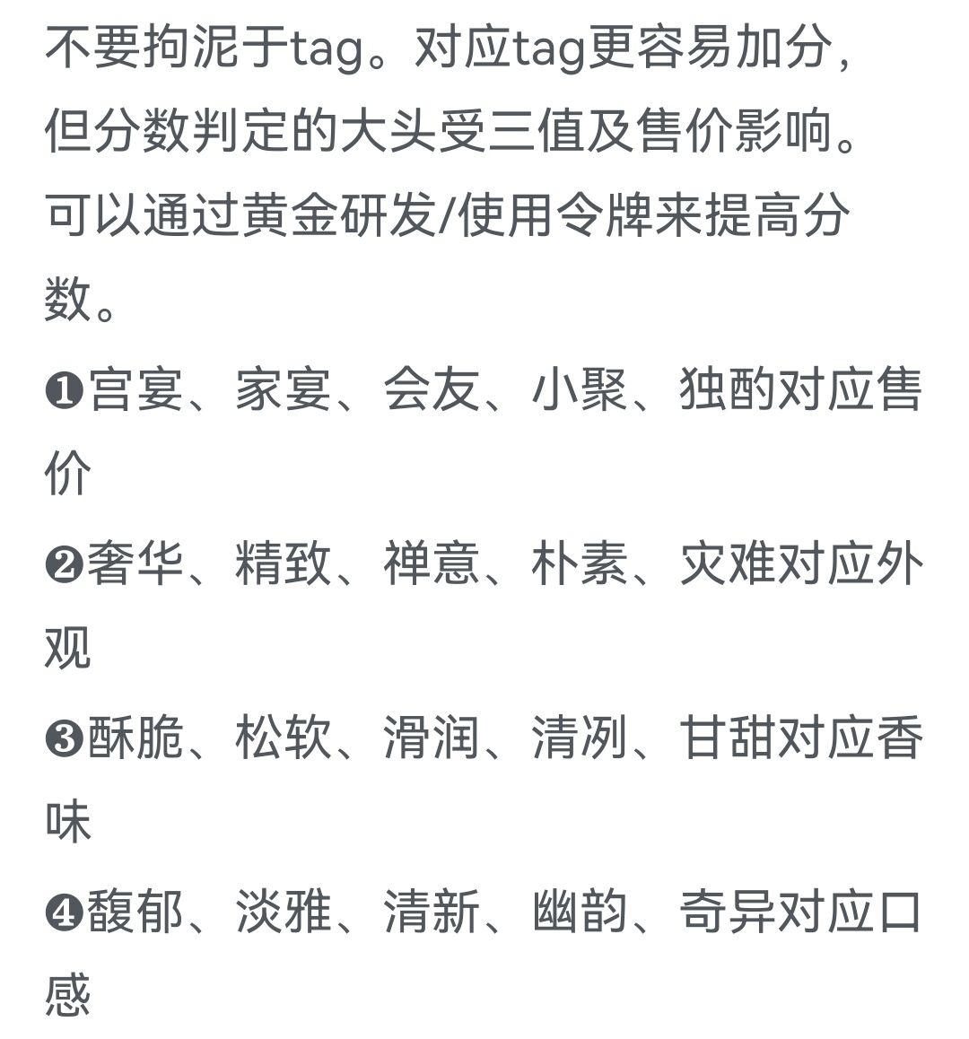 大家晚上好! 本篇鸣谢七千肆数据支持,以及 景妗(ID:32560359)大佬、 眠眠(ID:119523374)大佬的鼎力协助。 (还有感谢下敲了两个晚上表格的我) 事先说明:实验食方售价均为0级食方,在同等情况下,条件下进行对比得出的结果。 顺便贴一下 以下为正文 ——————————— 省流模式 前期(1~3) 芝麻糖、莼菜小鱼羹、苹果酒 中期(3~7) 花生占、葱盐 后期 陈皮糕、花枝脍、