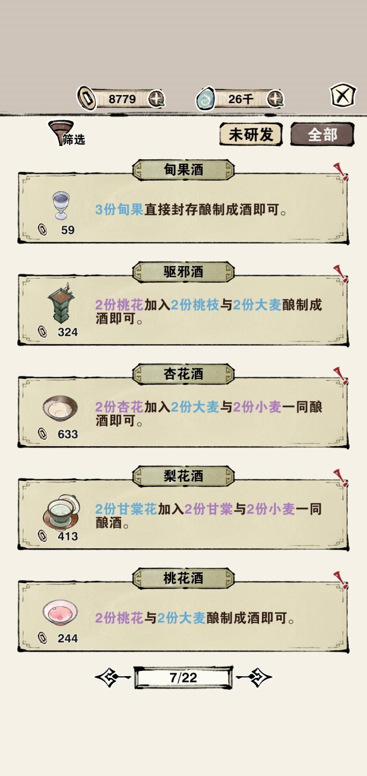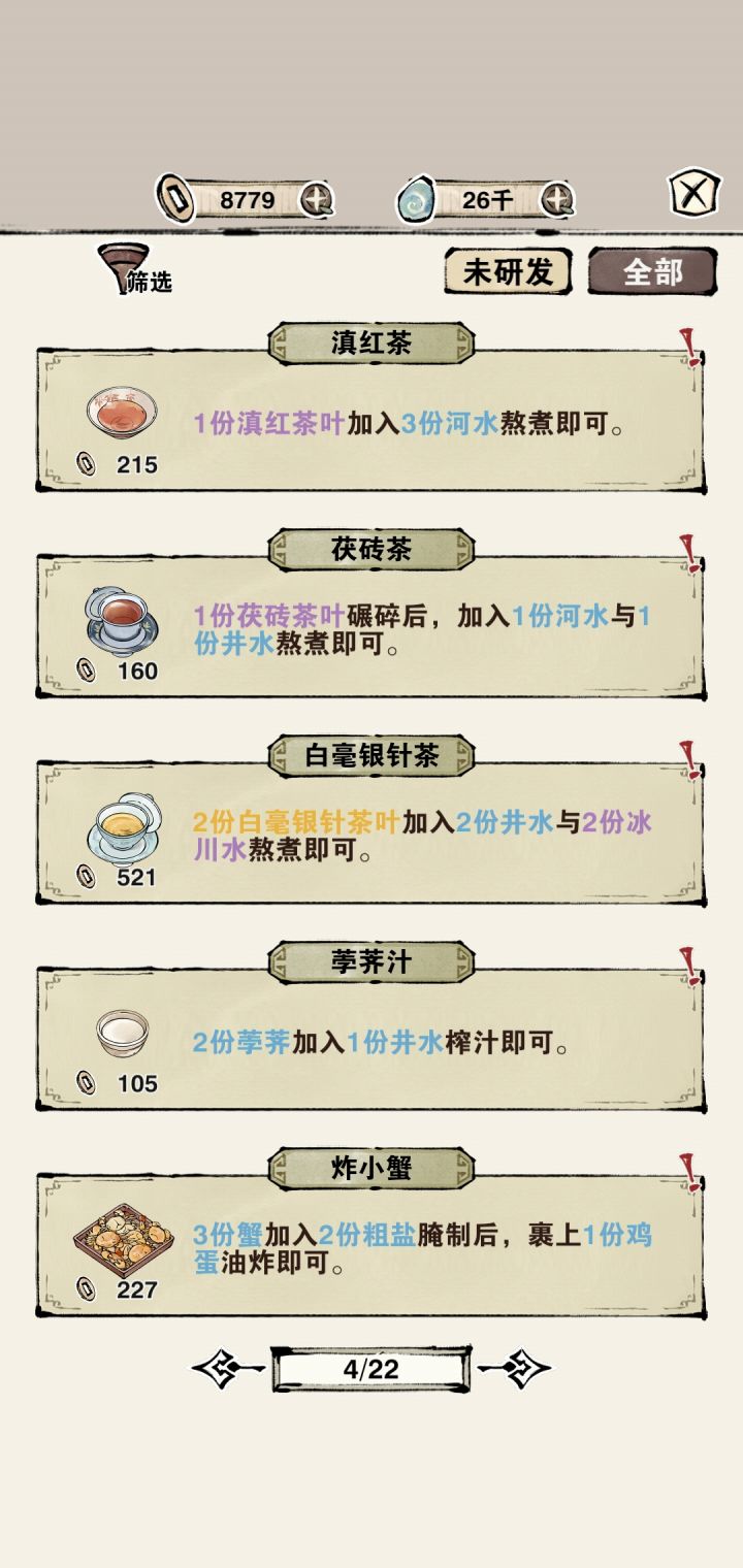 一篇答疑贴,其实玩过二十肆工作室的另一个游戏「鸣沙客栈」的朋友们应该对这个游戏更好上手,那么此篇就是提供给新手朋友们参考的一、关于小屋目前本人已解锁研发,制作,图鉴,后院,外出,成就功能(没记错的话制作及研发每个用户进入游戏都会自动解锁)①研发 通过获取食方进行制作食物及茶类等;食方蓝字部分是制作所需的材料及多少,最后一句话往往提及制作方式,如徒手或熬煮等,那么制作时则需切换至相应工具(我记