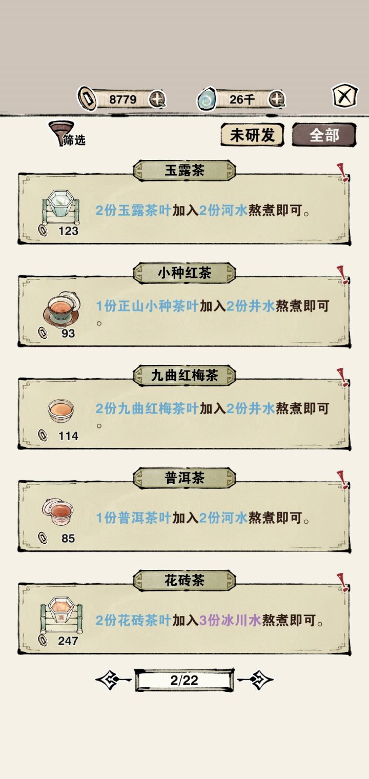 羁绊结局伴随轮回结局,一次轮回只有一个羁绊。想快速拿到所有结局需要刷轮回。方法再说一次:开业只上一个茶饼,直接关门。快速达到24年。【挑战】如果想达成三个结局和满好感,最少准备三份食物,岁寒堂四份。挑战0:10份岁寒堂(商人售) 口感10(一级够)挑战1:20份辉日月(集市售) 外观<-15(一级使用负值令加道具)挑战2:50份龙眼冰酒(集市售) 香气>30挑战3:80份白牡丹茶(商人