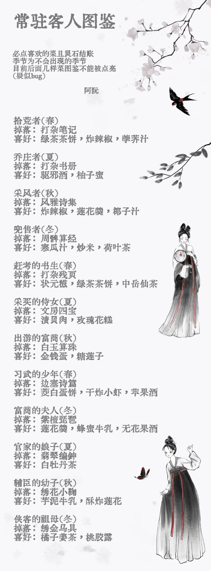 常驻客人会掉落不同的道具,好感或是经验他们也有自己喜欢的食物,据我观察,卖这种食物的时候客人刚好点到,才会在图鉴里面点亮。吃到喜欢的菜会灵石付账,目前后面几样菜不会被点亮,但是能看到给的是灵石。必点自己爱吃的菜。季节代表他不会出现的季节。拾荒者掉落:打杂笔记喜好:绿茶茶饼,炸辣椒,荸荠汁乔庄者掉落:打杂书册喜好:驱邪酒,柚子蜜采风者掉落:风雅诗集喜好:炸辣椒,莲花羹,椰子