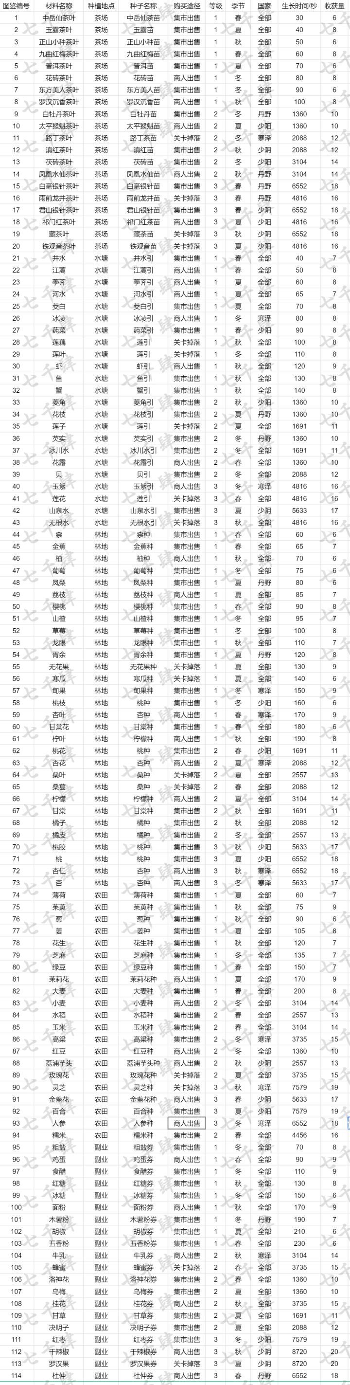 使用指南:1、测试版1.0.4制作,1.0.9补充了游戏图鉴的截图,方便对照。一些种子时间可能略有变化(但问题不大),有其他问题会及时更新(也可能不及时),也可以直接问我(但我回复也不及时),也可以加官群提问(推荐,有很多大佬会及时回复的)。2、种子怎么获得?为什么有的种子刷不出来?请查看表格版中的“购买途径”,或移步。商人出售:外出—种子商人。关卡掉落:测试版暂未开放关卡,只能在种子