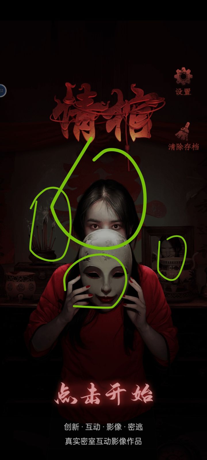 玩好了第一遍来随便记下线索(我很菜呜呜勿喷*从进入游戏的封面可以看到一个双马尾拿着面具的妹子这个面具也在第一章剧情里出现了,由此可以看出这个妹子就是姜殊曼。她穿的是大红衣服,后面是囍字和在烧的香,可以看出这是在灵堂,旁边还有一张黑白照片,梳的头也是双马尾,但眼睛已经被白布盖上了,我认为是瞎了。在点击了开始游戏后,妹子的眼睛变成了白色的没有眼球,说明她确实瞎了。而且照片里的就是这个妹子,这个妹