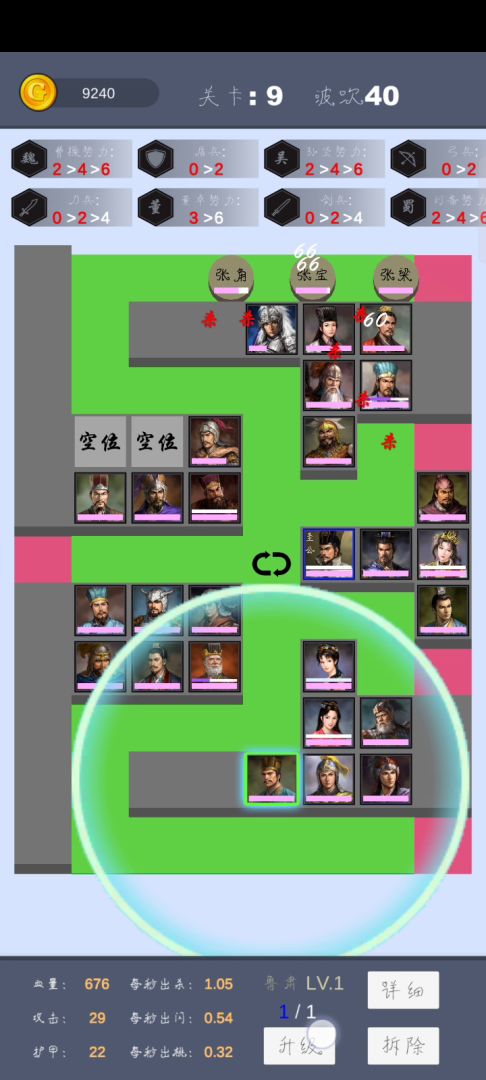♛小攻略〖从评论截取,想完整观看可去评论区〗1.塔防的核心是主公不死,小兵和野将(小boss)只会游走输出(但好像主公仇恨更大)2.一个武将可以布置多个,但建议优先二级解锁技能,能量条看不见(可能是bug),但可激活时发白,点击便可激活(升级时会误触)3.武将可升级,一级到二级需要一个该武将,二级到三级需要两个该武将,目前没见到四级。获取武将在每次结算后。4.武将升级后基本是大部分数据都升