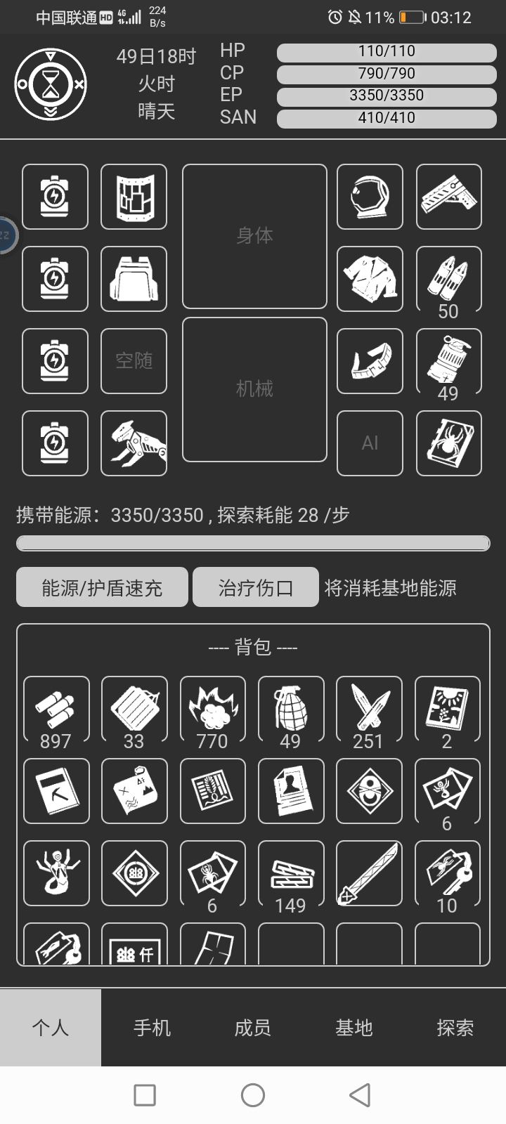这是一款文字游戏,跟着剧情走就行了,玩了好几天,除了AI和空随以外都有了,钻探工程之地能一次性收刮大量矿石,碳可以在火力能量转换里转换成能量,20小时能活动4500能量,一日9000能量,所以能量是溢出的。还有好多游戏道具可以在地下城的商店买,幽梦币很容易获得,钻探工程之地能挖到宝石,然后在地下城里找到奢华商店就能卖几万。机器龙没必要带,伤害低而且一步减4能量,除了加100精神值以外就没啥了,带着