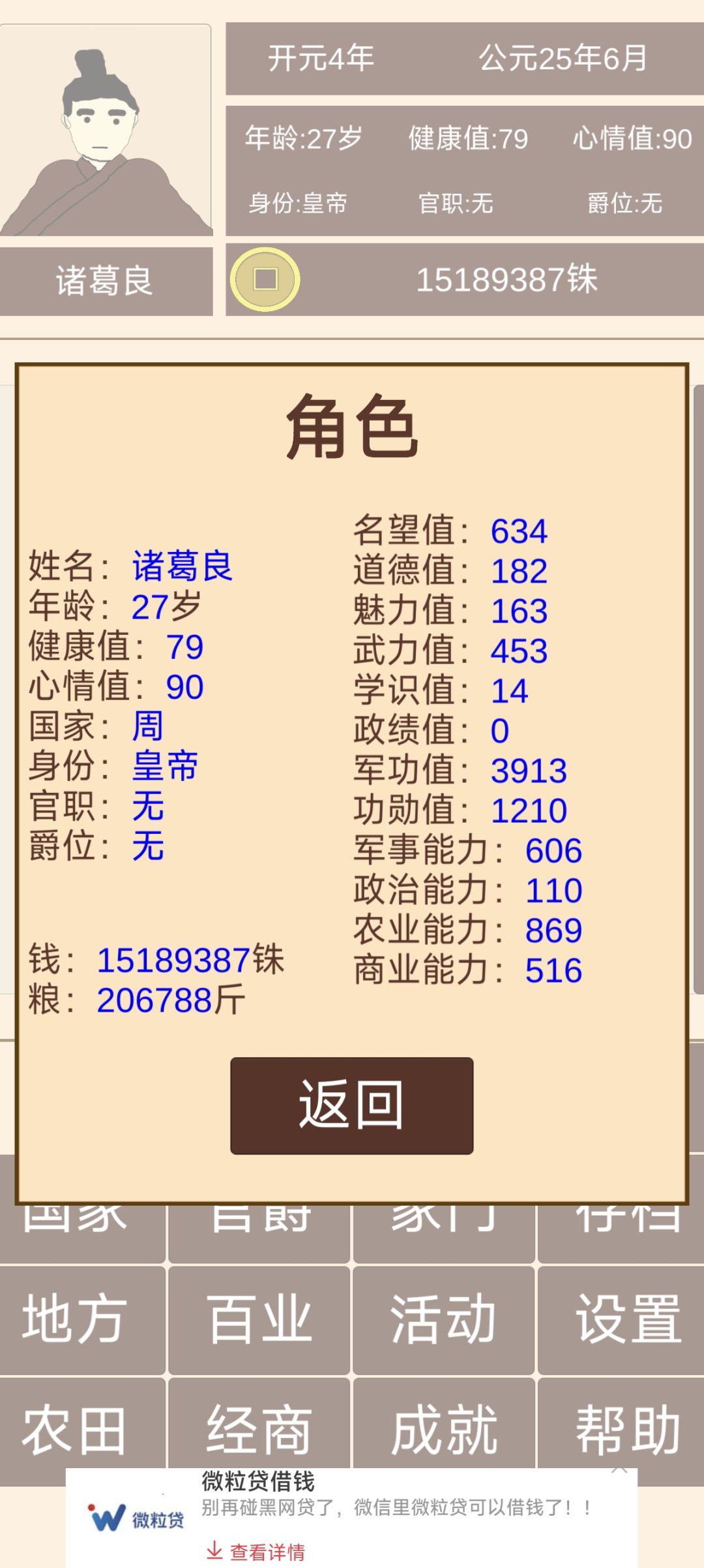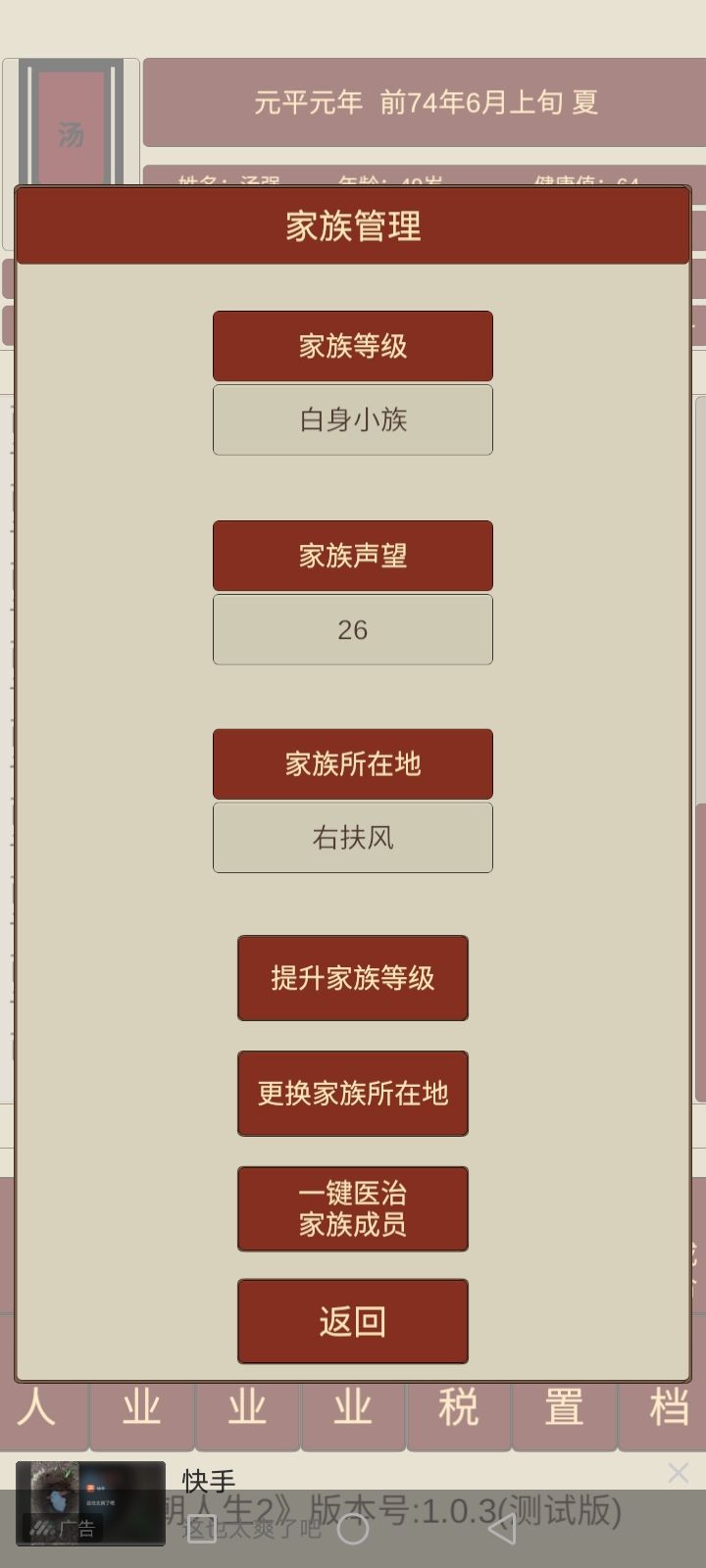 经过第一代、第二代基本都够了,就看你的命了,寿命不够活着到丞相(大将军)这个官职赶紧造人,把健康值用完选择下一代开始称帝之路,一般能活到80岁以上就能当上丞相(大将军)。