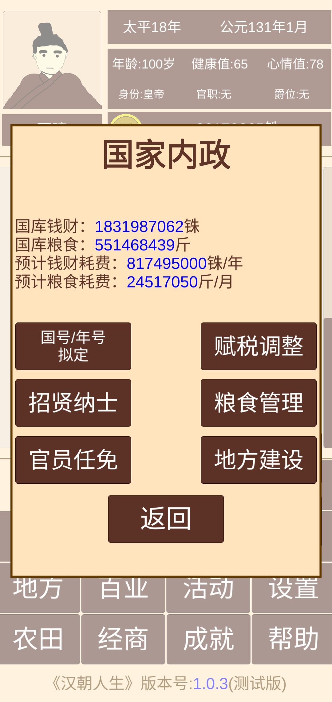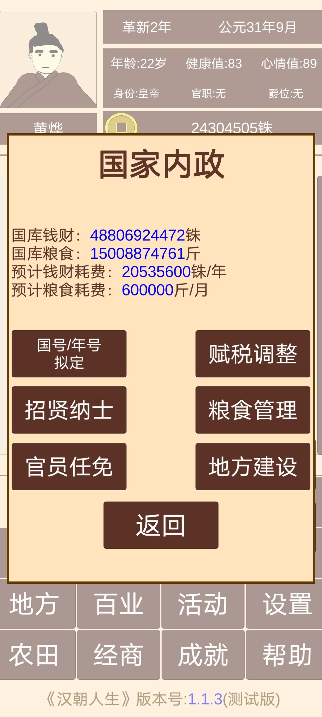 记得把每个郡太守任命了,税收选中税,不能选高了,会失民心导致起义(义军就是你原来拥有的守军)。地方建设选民心。进军事把每个郡可调用军转换守军安排在15000个。每个月会有几率被攻打,会死10000左右守军,记得补齐再点击下一个月不然会有几率再次被攻打导致失守。到1月继续看内政,每攻打一个郡就会提高财政能力和粮食。刚开始打个一两个。占领的多了就可以一次打好几个,经济,粮食会越来越多不会少的。直到统一全部。