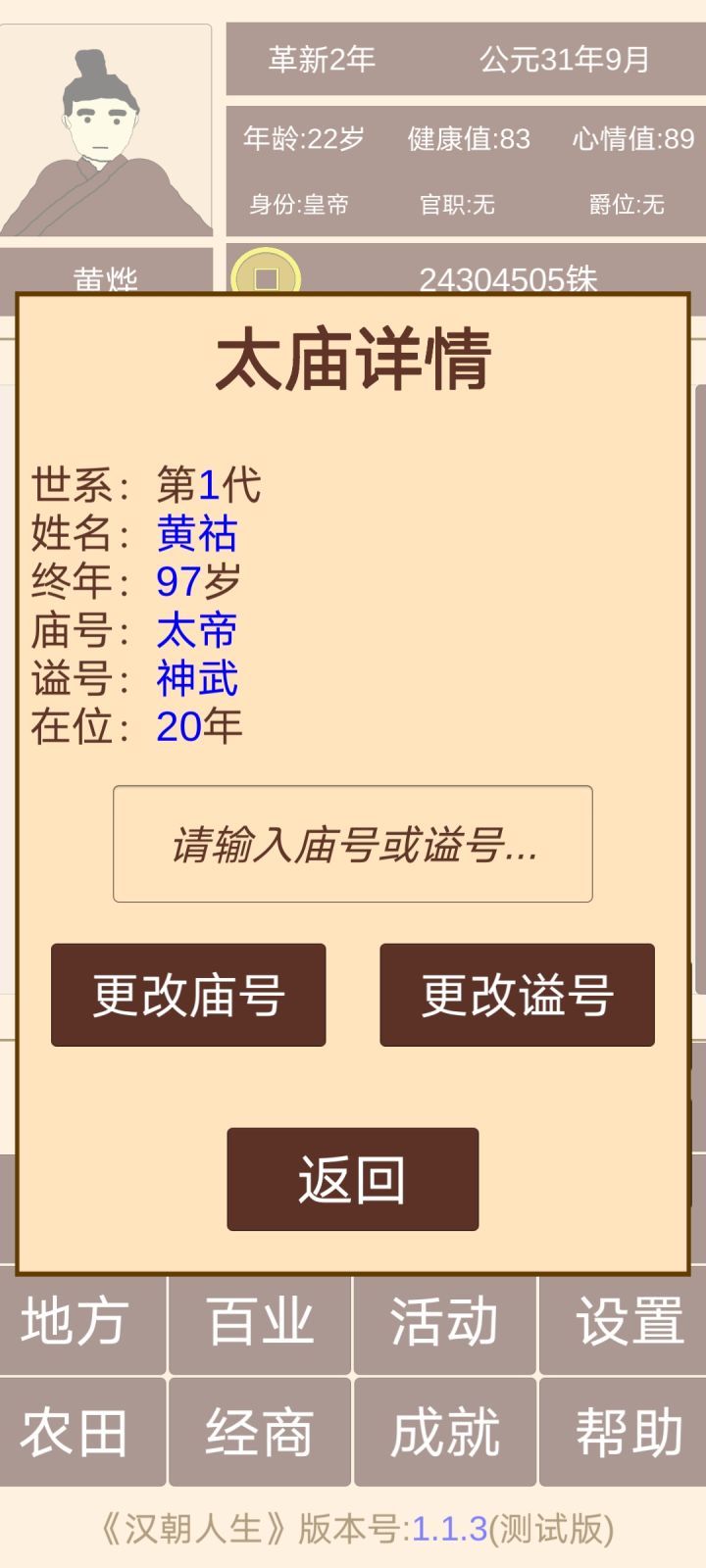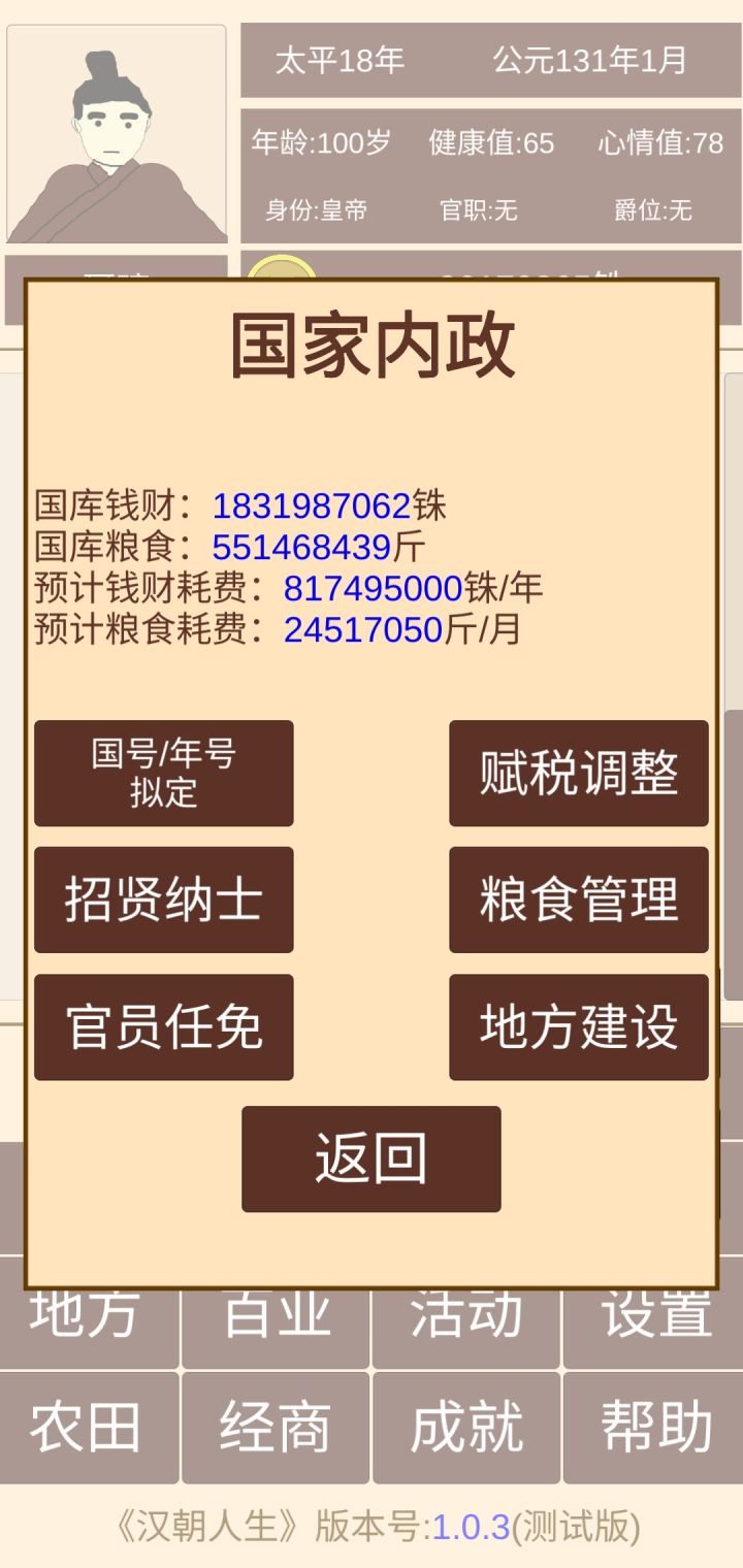 没有看一个广告,也没有用礼包。前期简直太受罪,我父母差点饿死,活到六十才有了第一个官做,初代地狱模式太真实太不容易。 从平民升到有官做,这一步真的苦了我的父母 然后父亲还没享福就西去了,六十多有了一个儿子,仅仅能养得起一个 然后一步步升官,升爵,买地,做买卖 后期简直人生赢家,随便生娃,啥都是自动的根本不用管 赚到一千万,跟其他地方送钱搞好关系 我诸葛家一定要自己建立新的蜀国!!!