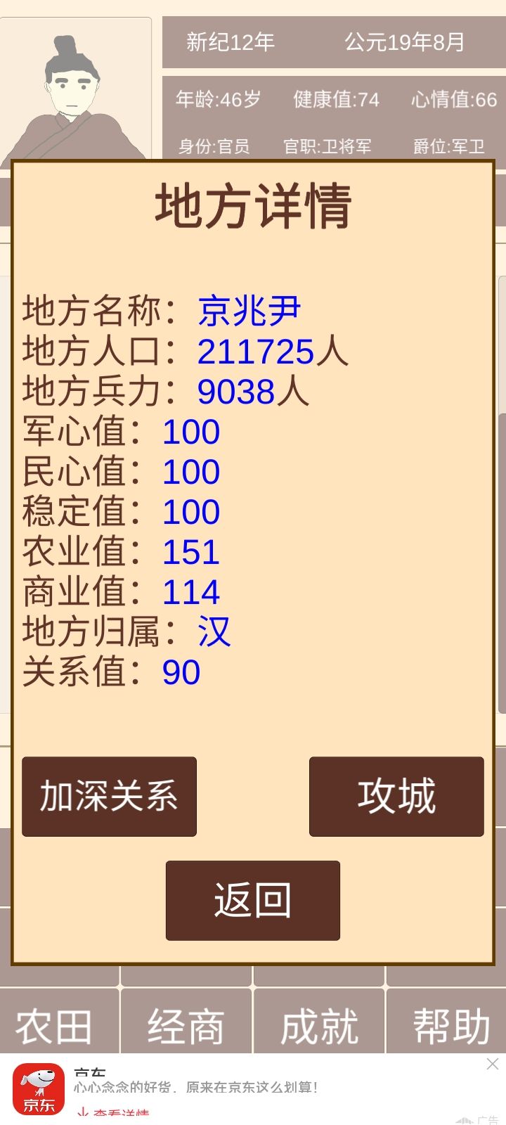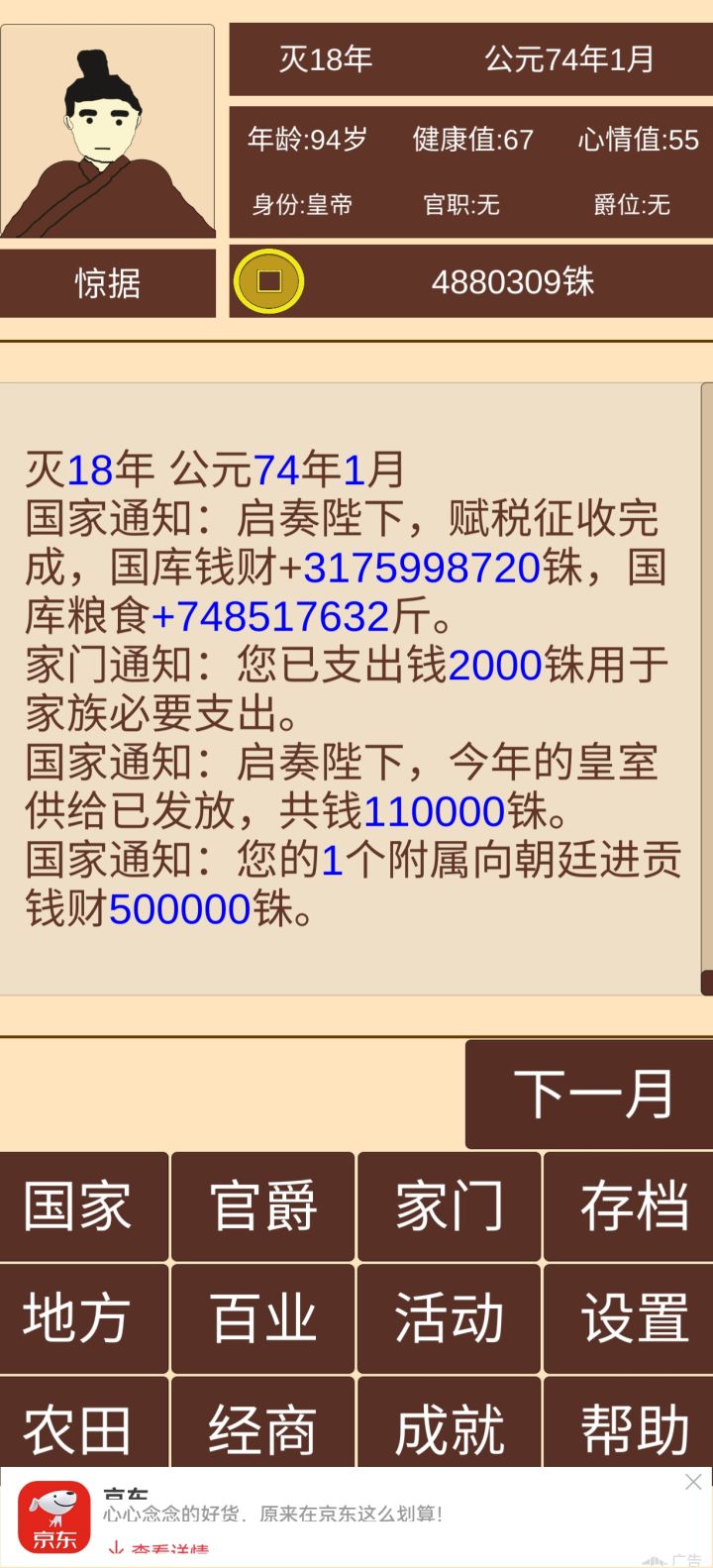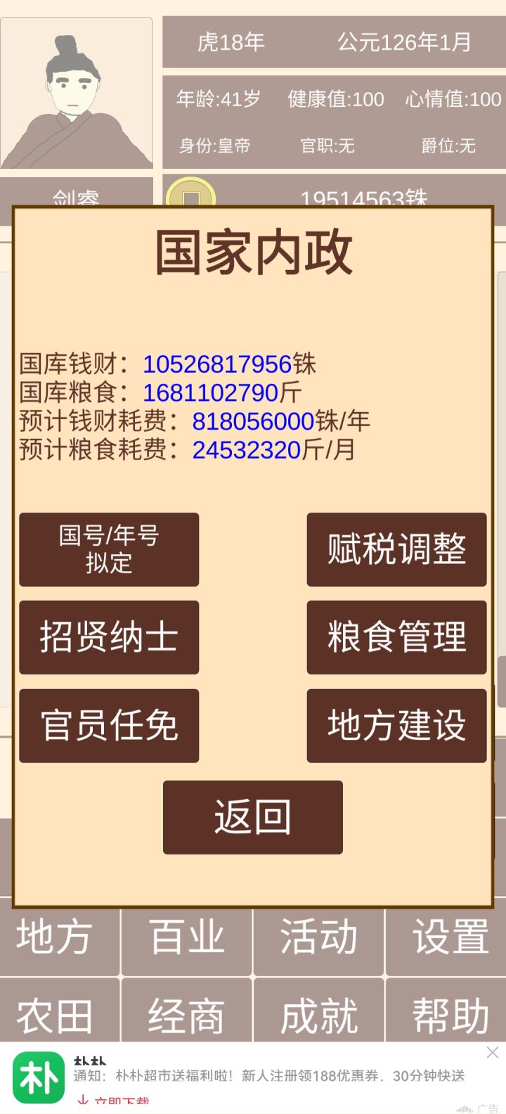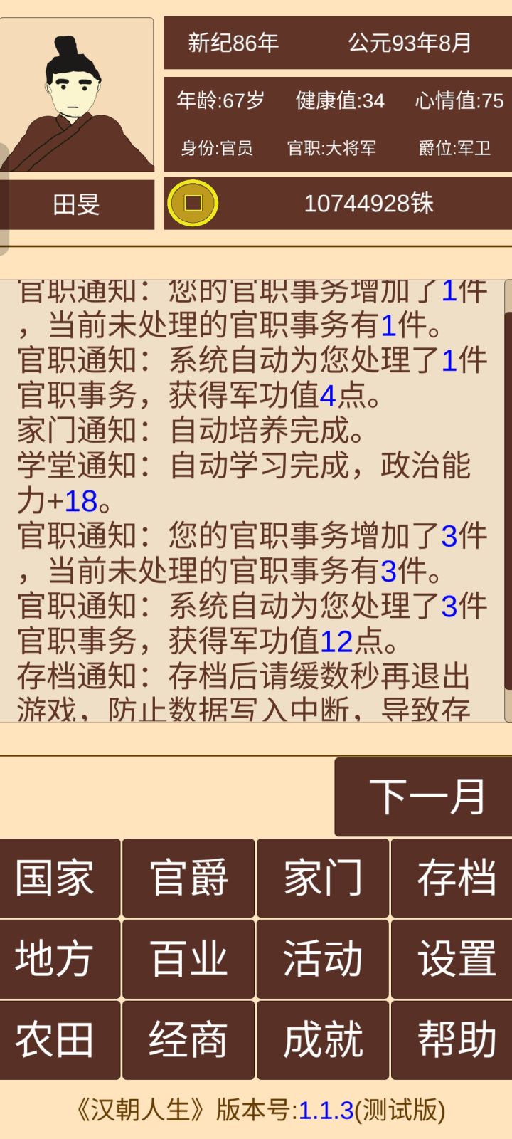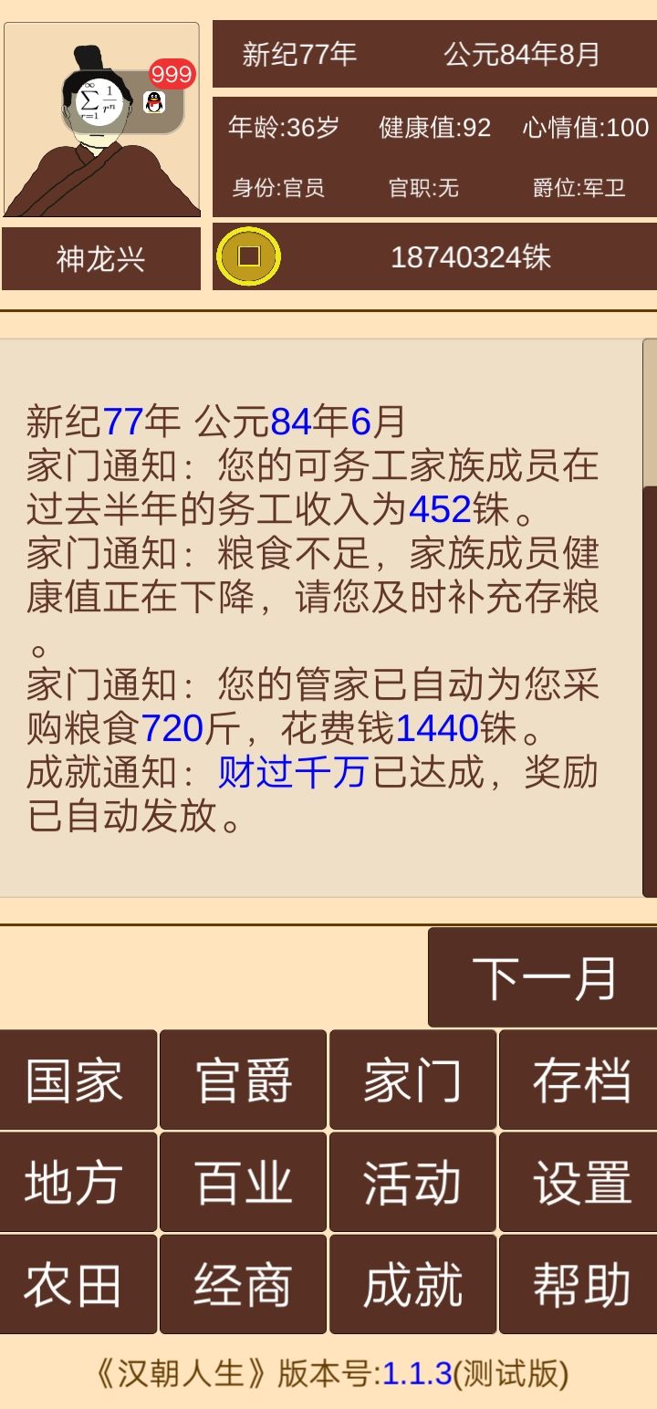 记得把每个郡太守任命了,税收选中税,不能选高了,会失民心导致起义(义军就是你原来拥有的守军)。地方建设选民心。进军事把每个郡可调用军转换守军安排在15000个。每个月会有几率被攻打,会死10000左右守军,记得补齐再点击下一个月不然会有几率再次被攻打导致失守。到1月继续看内政,每攻打一个郡就会提高财政能力和粮食。刚开始打个一两个。占领的多了就可以一次打好几个,经济,粮食会越来越多不会少的。直到统一全部。