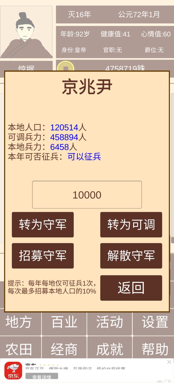 首先要把每个地方郡守攻打了后在去征服战争(一次征服战争损失10万兵力,郡守损失1万兵力)提前去打征服战争很大几率会经济崩盘。