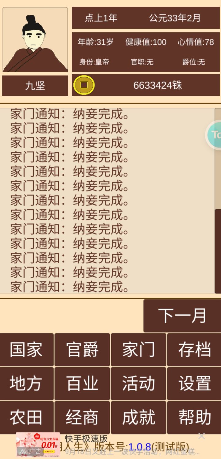 注意事项:门客、活动值、学堂灵活运用,需求什么就安排什么。其实商业,农业就是过度期,最主要的还是把成就值弄够换玉玺。后面的自立跟家族农田,钱财毫无关系,是两个体系。