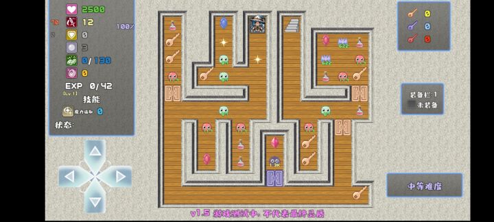角色属性养成同魔塔本体差不多,技能获取速度比较慢,但基本上没有无用技能,可以作为一种主要输出手段。装备槽位需要解锁才能使用,最初只有一个格子,能用的装备也很有限。