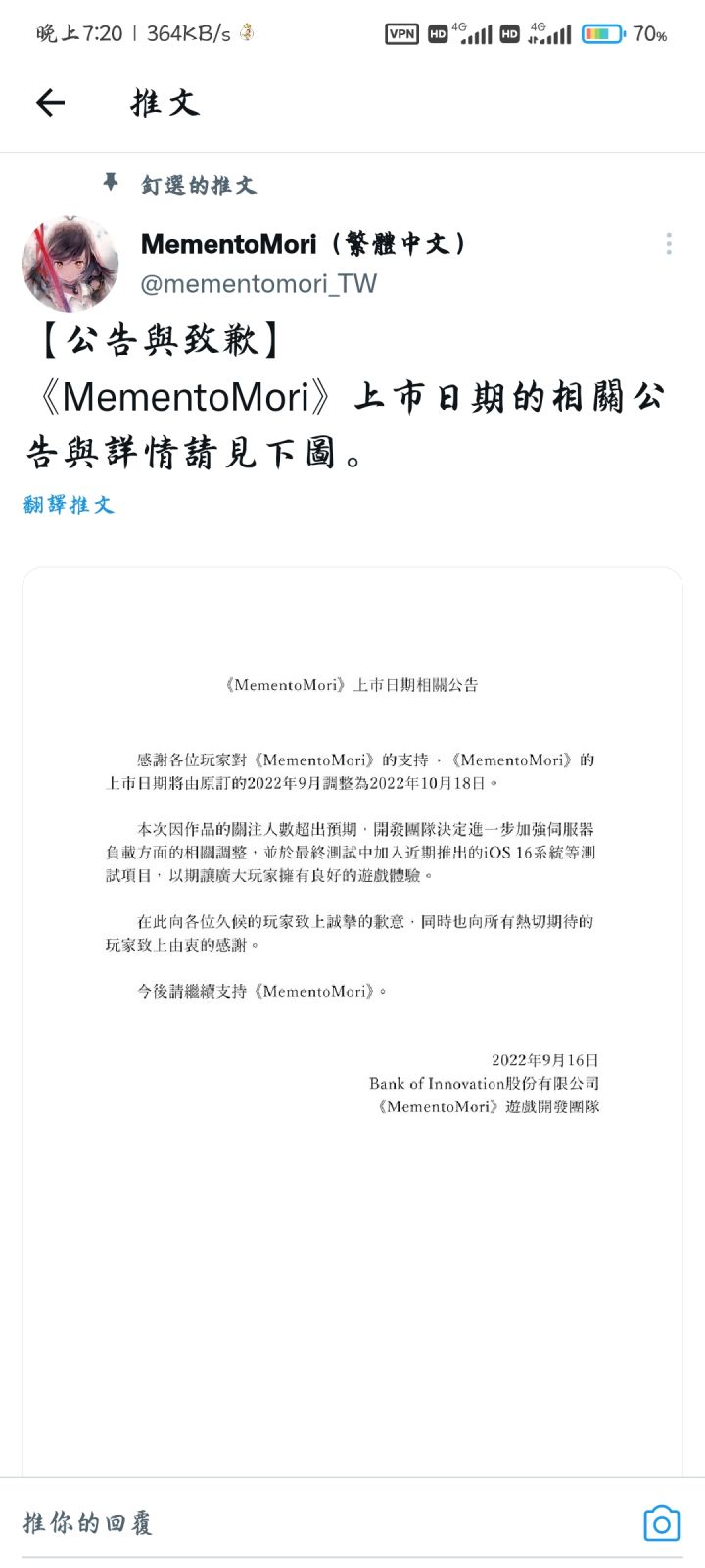 RPG手游《MementoMori》宣布9月上线(海外),官方自我介绍为“史上第一款足以名留美术史的RPG”。有一些少女被人称为「魔女」,她们是一群平凡的女孩,只是会使用一点点特殊的力量。当灾难在大陆上蔓延,圣枪教会宣告发起了「魔女狩猎」......游戏还搭配了诸多BGM,让少女们在「抒情诗」中,用歌声诠释每个人内心的情感。
