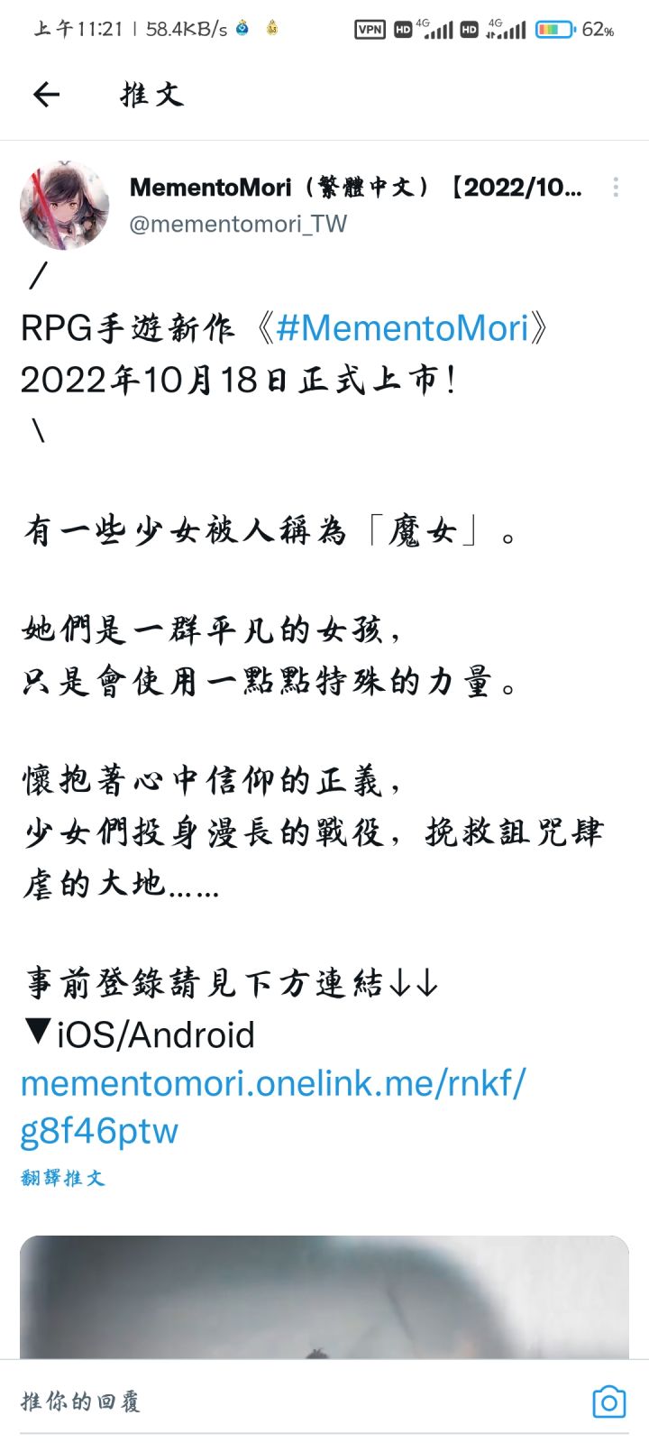 推特官号最新消息:/RPG手遊新作《#MementoMori》2022年10月18日正式上市!\有一些少女被人稱為「魔女」。她們是一群平凡的女孩,只是會使用一點點特殊的力量。懷抱著心中信仰的正義,少女們投身漫長的戰役,挽救詛咒肆虐的大地……事前登錄請見下方連結↓↓▼iOS/Androidmementomori.onelink.me/rnkf/g8f46ptw