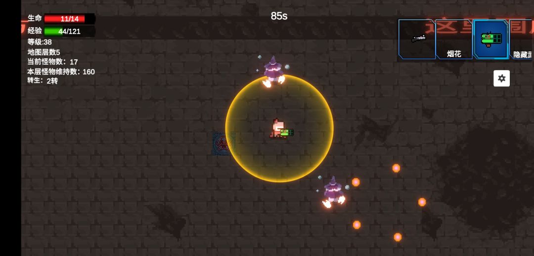 一 武器 武器一共有五种 手枪,烟花,风火轮,激光,泥潭 其中烟花,风火轮,泥潭是通过升级获得的。。。手激光是通过兑换码激活的(在设置里输入:佛系修仙) 首先说一下风火轮,个别人玩的时候增加弹幕数量会卡bug,弹幕数量为二的时候会以弧线发射而且还是一个,★我们只要切换一下武器再切换回来就行了。 然后是泥潭,泥潭不建议用,他会吧怪吸过来,比如你向正前方发射泥潭,怪就会反方向冲过来,怪物会直线行驶直到撞墙才会停止,而且泥潭发射的子弹是一团光,★怪物被吸过来的时候会经过光团,并且会被覆盖住,很容易被怪怪温柔的拥入怀中,建议转圈打怪。可以考虑增加射程和范围,只要你一直放泥潭,怪物们就出不来 烟花类似散弹枪,特效没有风火轮多,手机带不动的可以玩烟花。 激光,有点鬼畜,挺好玩的,★激光条数因为层数限制,额外增加的条数只能低于等于本层数 手枪,我只能说玩到极致,不会弱。 ————————————————— 二 游戏内容 ☆篝火 站在附近五秒会进入下一层,★而且怪物血量会增加(层数越高怪物增加血量越多),每层精英怪血量都是小怪的二倍,且经验和小怪一样。(精英怪为红色) ☆怪物出生点 在地图两侧和地图正上方的通道里每层都有怪物数量上限,并且会一直保持,★每层加两点上限不要站在地图中间容易被包围。 ☆魂火 怪物死后会掉落,★存在七秒左右吧,如果不及时收取会消失。 ————————————————— 升级选项 ☆武器选择 如果你想玩其中一种武器就不要选择其他武器选项了★不然升级时会刷到不只一种武器的强化选项 ☆武器强化 有射程,伤害,角度,武器弹幕数量,★手枪,泥潭不会增加弹幕数量, ★手枪,泥潭,激光,不会增加角度 (个人觉得射程不需要,毕竟打远了魂火你又够不到,emmm风火轮除外,它容易跑的怪物的后面威吓怪物使怪物害怕,只要射程够远理论上风火轮是可以绕怪物三圈的☆手动滑稽☆) ☆人物强化 ★增加血量上限(你的血还剩多少就剩多少不会变化), ★增加移速(非酋快跑), ★增加吸取魂火范围,增加经验(就是醍醐灌顶,这个我个人觉得是非常好的), ★恢复所有血量,(残血福音) —————————————————