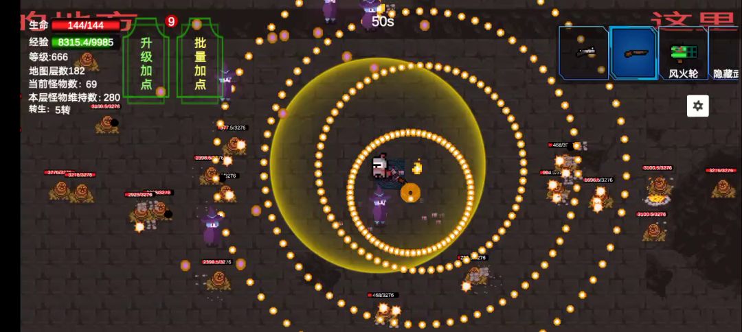 这武器和风火轮类似,属于后期攻速拉满才能玩。 前期攻速太慢,还没上好子弹怪就到脸上了。再加上子弹覆盖的角度小,没有合适的挂机点,只能在中间管道上下移动吃经验升级。再有就是满屏子弹打boss很难受。