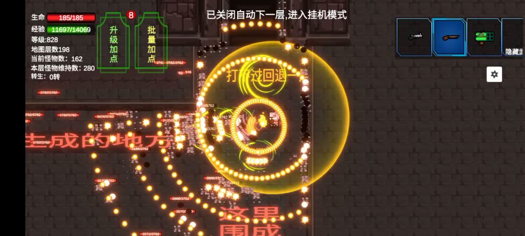 范围模式原地挂机,合体模式70发合1,boss几下带走。就是前期不容易起来,建议一关一关自己过,不要跳关,等200级解锁穿透之后就随便玩了。 另外新手玩家好奇的转生,就是打过一次boss通关之后就可以转生了,通一次增加一级转生等级,并且增加武器一定比例的伤害(比如烟花转生一次会增加0.3的伤害,包括初始伤害与升级伤害)