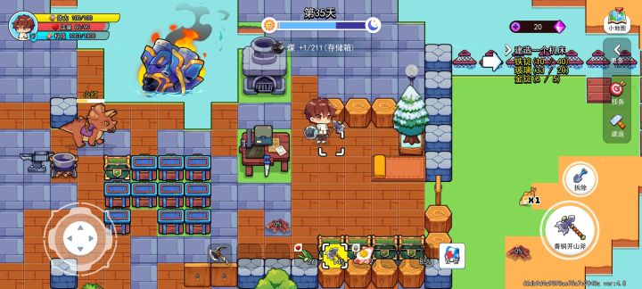 作为一款即开即玩的小游戏,它的质量是可以的,画面偏向Q版可爱风,生存难度不大,没有随时间削减的饥饿值,只有体力条和生命值这点我觉得值得表扬,后期基本就可以靠宠物龙来解放双手。天赋加点当中我觉得资源管理是神!自动放进存储箱这个功能大大减轻了玩家的背包空间压力和负担,还有矿井这个自动采矿和碳窖基本可以做到煤炭和铜、青铜的资源自由。
