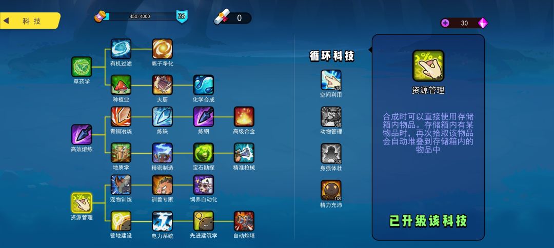 1.背包容量老不够 解决方案: ·收集材料建造箱子,并把一些不常用的材料放进箱子 ·升级【资源管理】科技,这个科技升级后箱子内的物品在合成时可以直接使用,不用放进背包;另外一些放进箱子内的物品如果后面拾取,会自动收纳进箱子。 ·将一些不着急用的物品丢弃在地面上,用到的时候再捡起(需要注意的是丢弃的物品游戏内一天会消失哦) ·把一些材料用掉,合成高级材料或者一些食物类的用掉 ·升级容量更大的背包,需