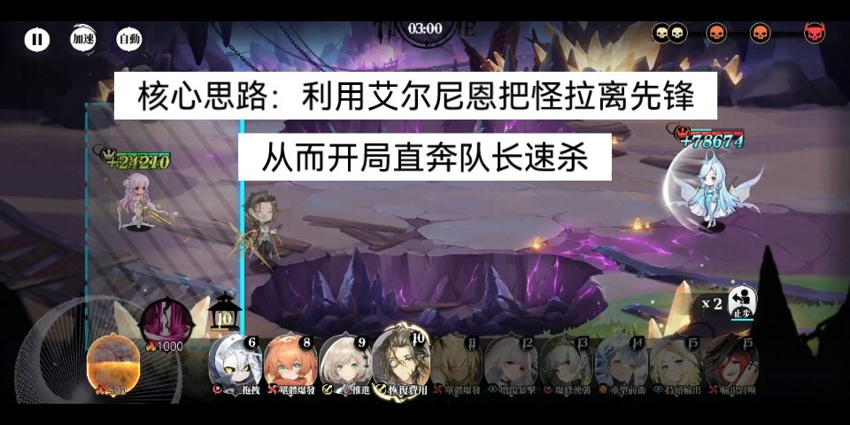 大概思路: 1.先放先锋利用高移速冲刺 2.迎面遇到敌方角色拦路直接放置艾尔尼恩打断对方角色登场技的同时拉回对方角色,保证先锋继续冲刺 3.接近地方队长后优先登场单体爆发角色尽可能多造成伤害 4.由于艾尔尼恩拉回的角色也在攻击我方队长,加速我方队长的怒气回复,从而能快速释放队长技补充伤害秒杀敌方队长,快速终结比赛#光隙解语