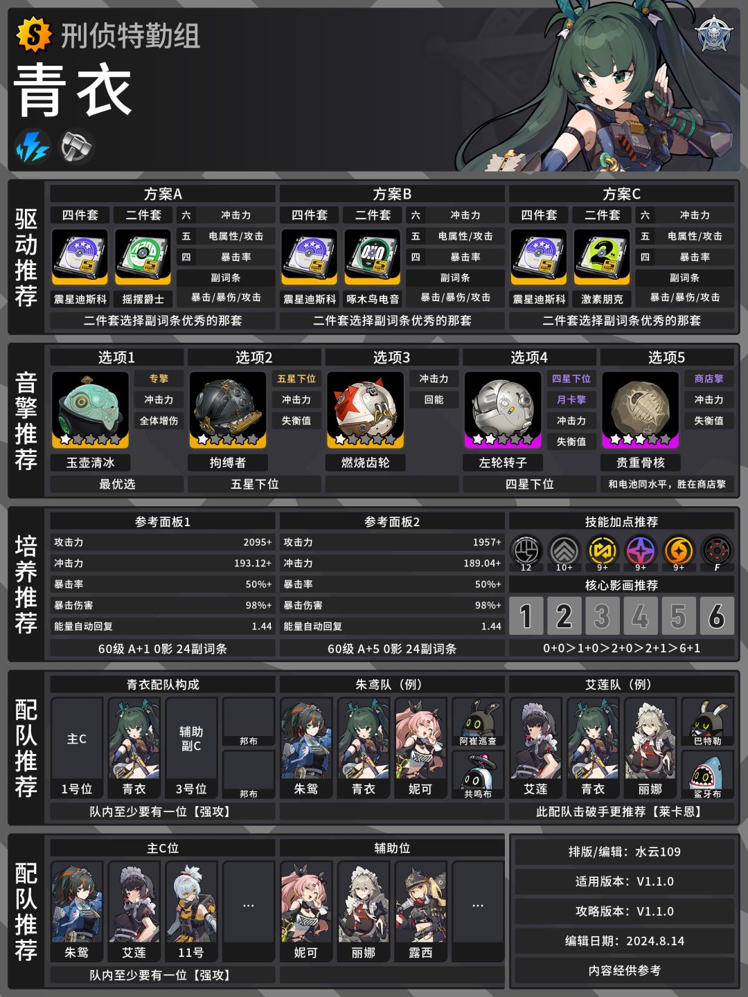 UID:12105内容来自创作体验服,开发中版本,实际内容请以正式上线版为准 哈喽喽,大家好!这里是『邦布帮帮团』的小橙子阿! 三生有幸,十分骄傲,小橙子我获得了绝区零创作者体验服资格。 因此本期小橙子将带来新艾利都治安局”阵营的即将上线的新角色青衣角色攻略(主要是一图流),大家可简单食用,详细攻略等一下青衣上线吧。 【简析&一图流】 青衣是一位电属性的击破代理人。作为首位限定击破C,青衣主要是