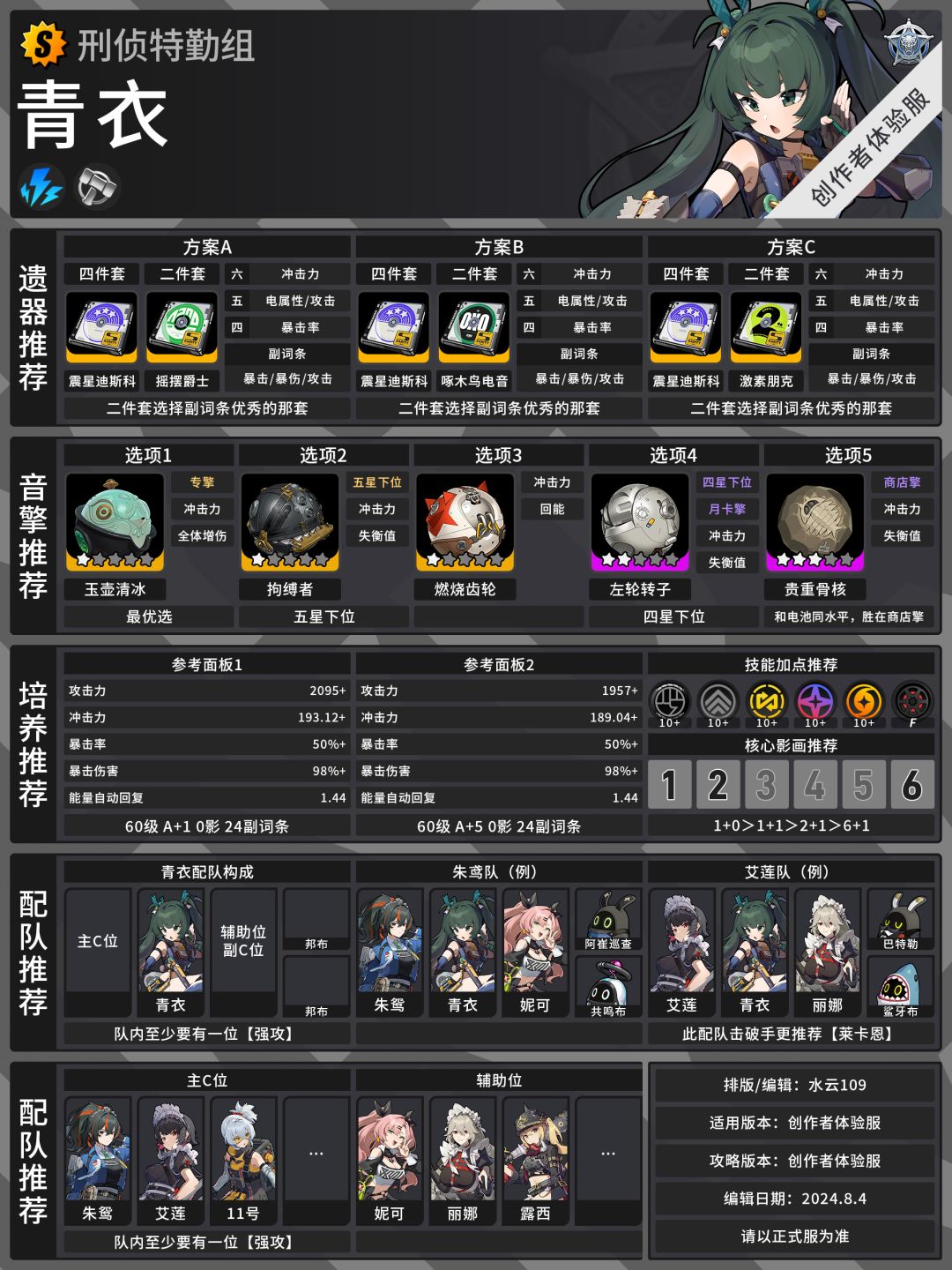 UID:15126409 各位绳匠大家早中晚上好鸭! 这里是幸获得创作者体验服的水云~ 本期为大家带来的是: 青衣前瞻攻略 观前需知 攻略制作根据源于创作者体验服 仅代表创作者体验服情况下的角色养成配队推荐 内容仅供参考 请注意右下角的 编辑日期 攻略版本 以便食用到最新版的攻略 驱动推荐: 请注意主词条顺序为 六号位 五号位 四号位 养成推荐: 参考面板: 红字为毕业属性 ——刑侦特勤组—— 限