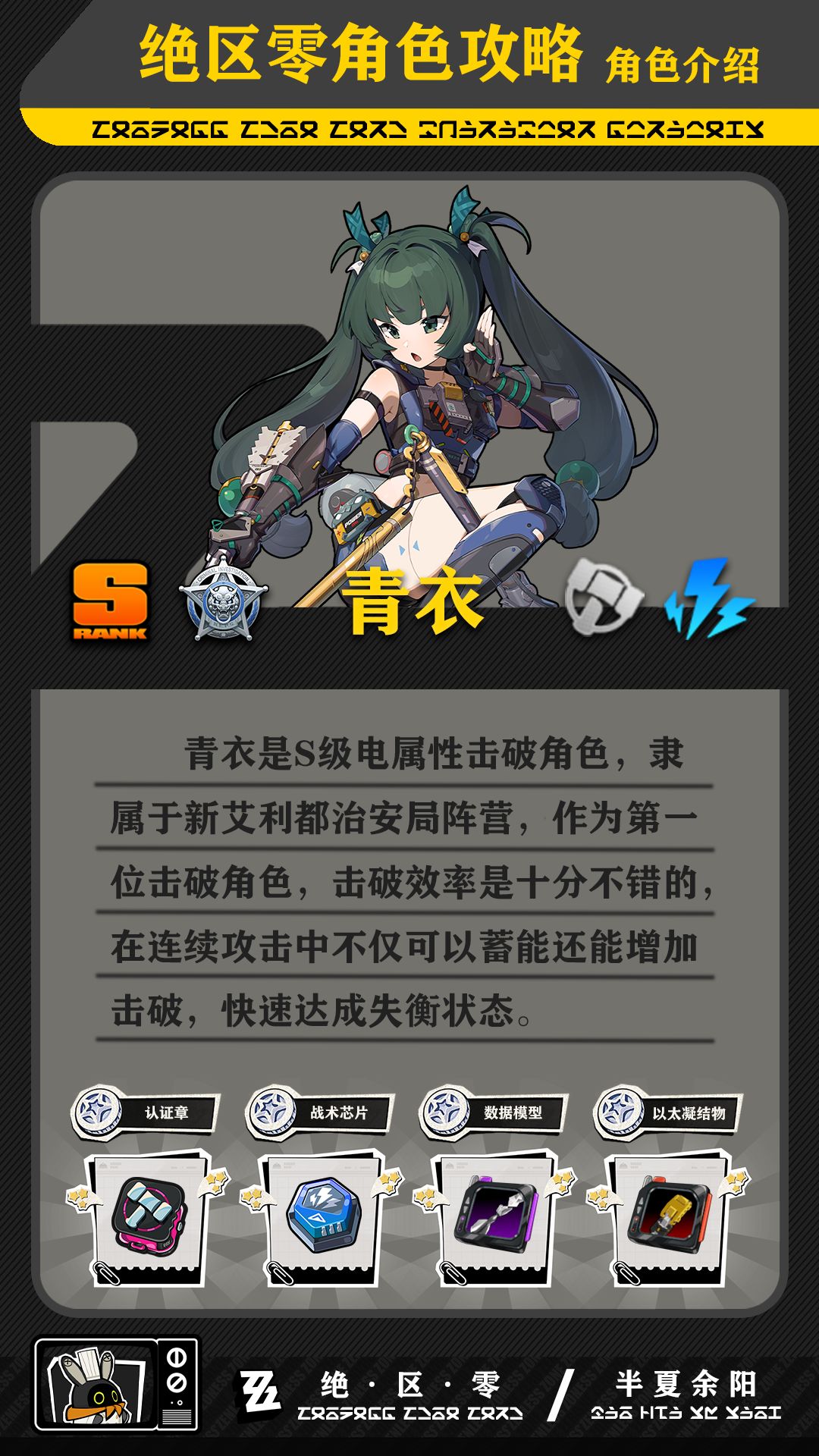 各位绳匠们早上中午晚上好呀,扒到了拥有绝区零【创作体验服】资格的@绝区零工坊 产出的文文。 工坊在版本更新前,根据【创作体验服】的内容提前为绳匠们制作攻略,带来了此次青衣角色简析,希望能帮助到绳匠们。 PS:下述内容仅作参考,均来自创作体验服,以正式服为准。 欢迎绳匠们加入企鹅大家庭【企鹅(裙)号:719134713】,探讨交流。 一、角色定位 S级电属性击破特性代理人,是目前泛用性最强,且能够提