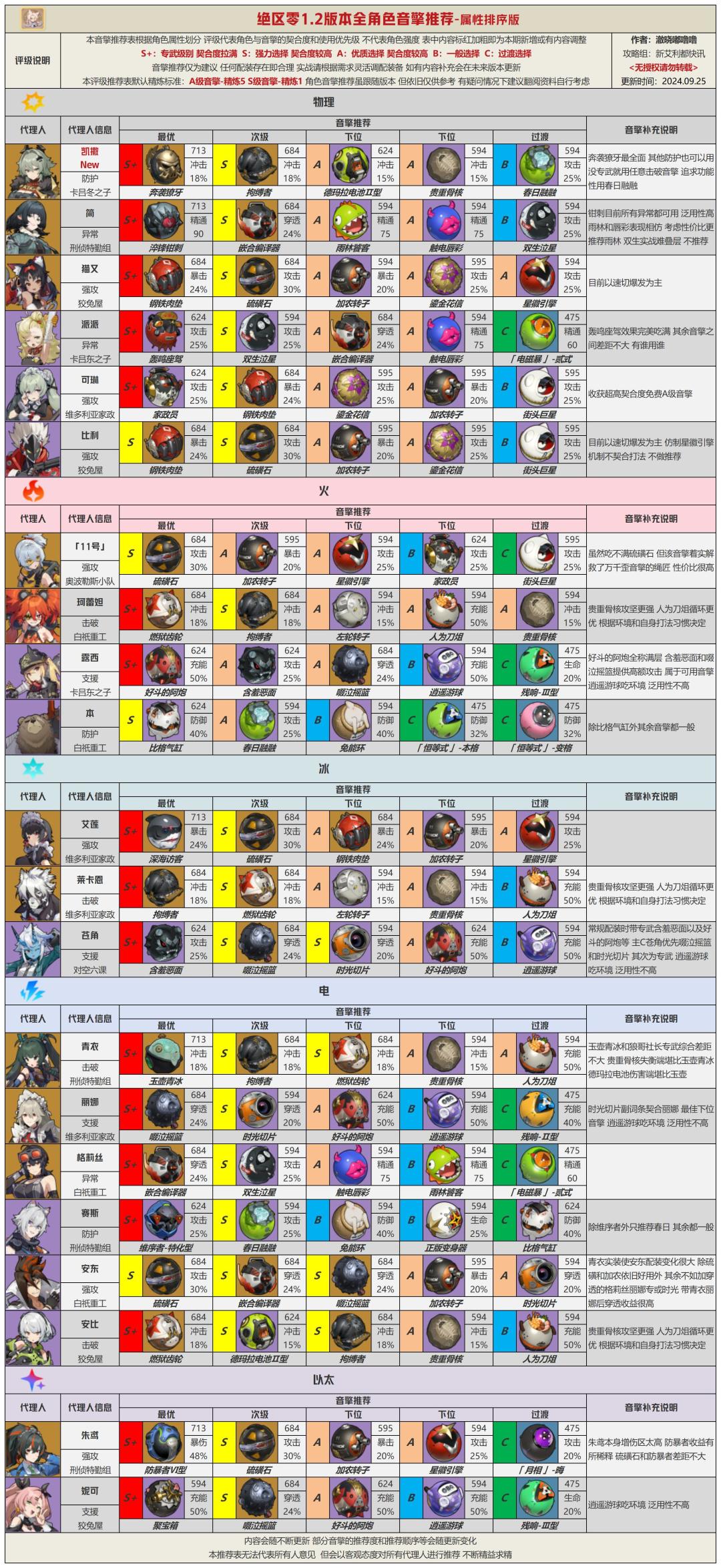 UID 10449294 各位绳匠们好呀,这里澈晓嘟噜噜! 绝区零终于上线了1.2版本,在新版本中实装了首位限定S级防护角色凯撒,以及两套全新的驱动盘,不少角色在配装方面又产生了一些变化。 今天为大家带来1.2版本全角色音擎驱动推荐,本期着重更新了凯撒和新驱动盘,值得一提的是凯撒的专属音擎下位并不是防护音擎,大家千万不要带错了~ 一切照旧,推荐榜分为两种排序方式,各位绳匠根据自己的阅读习惯保存即可